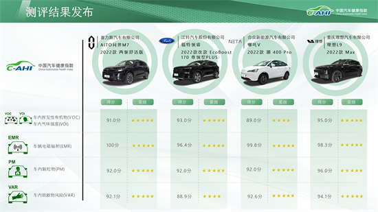 中国汽车健康指数2022年第三批次测评结果共包含4款车型,发布结果包含了车内挥发性有机化合物/车内气味强度(VOC/VOI)、电磁辐射(EMR)、车内颗粒物(PM)、车内致敏风险(VAR)五个维度。赛力斯汽车有限公司生产的AITO 问界M7(2022款 两驱舒适版)和重庆理想汽车有限公司生产的理想L9(2022款 Max)各测评板块均获得五星成绩;江铃汽车股份有限公司生产的福特领睿(2022款 改款 EcoBoost 170 尊领型PLUS)在车内致敏风险(VAR)板块获得四星成绩,其余板块均为五星。合众新能源汽车有限公司生产的哪吒V(2022款 潮 400 Pro)在车内挥发性有机化合物/车内气味强度(VOC/VOI)获得四星成绩,其余板块均为五星。