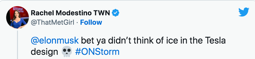 瑞秋在推特上发布了这段视频,抱怨特斯拉的设计没考虑到冰雪天气。有网友说,可以用手机上的APP打开车门。