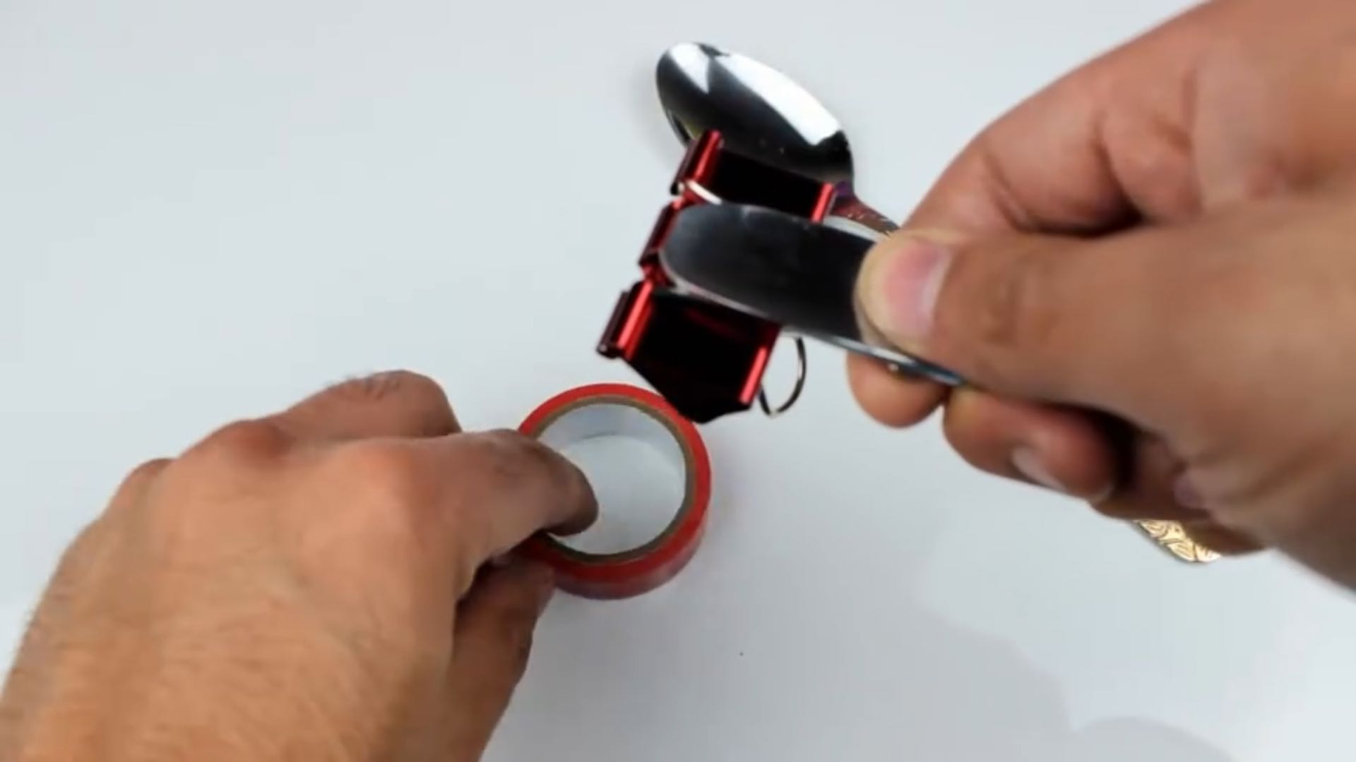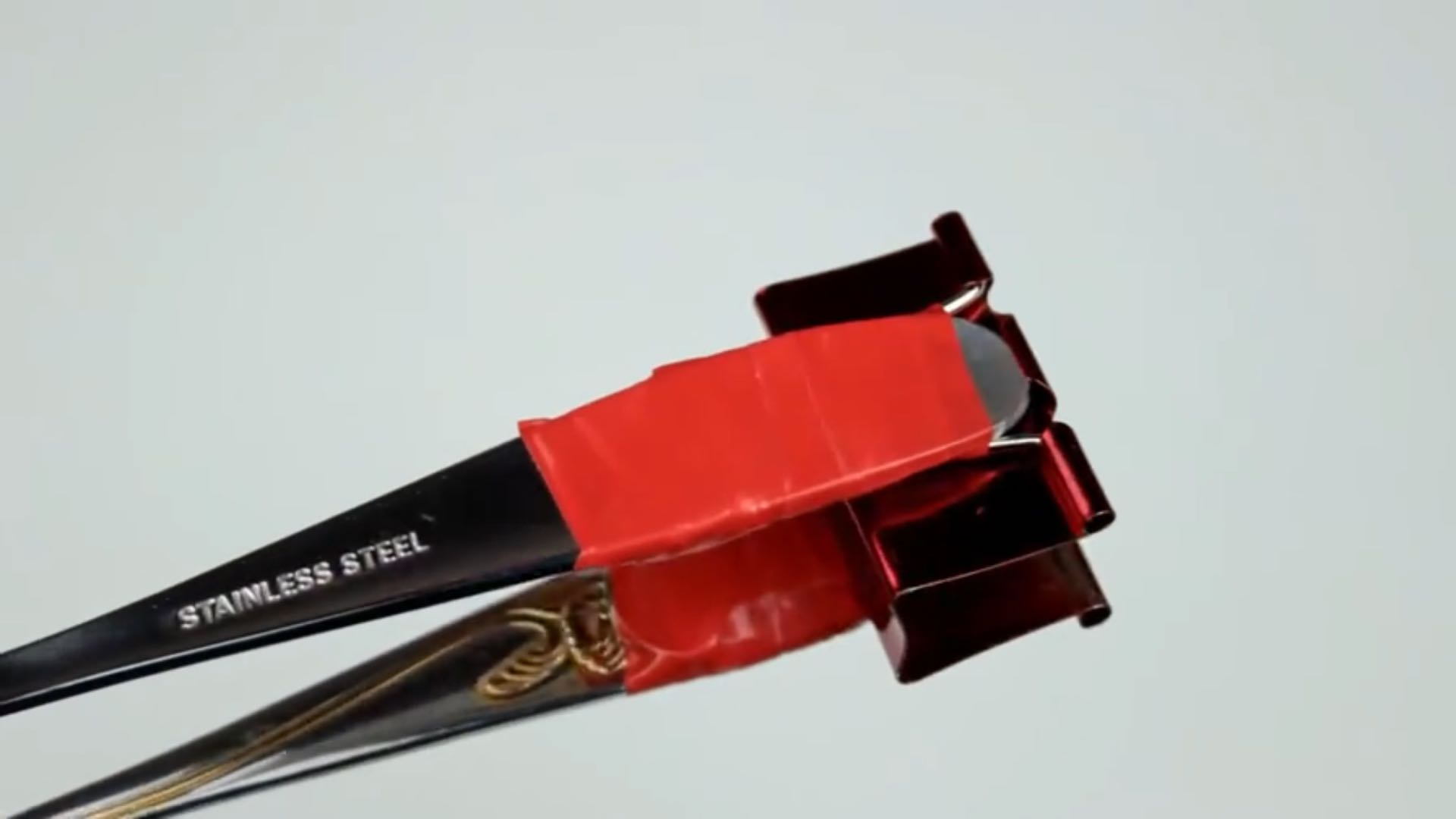 a. 首先将勺子的手柄部分与燕尾夹的燕尾用胶带纸粘在一起,注意勺子要粘在燕尾夹的外侧。
