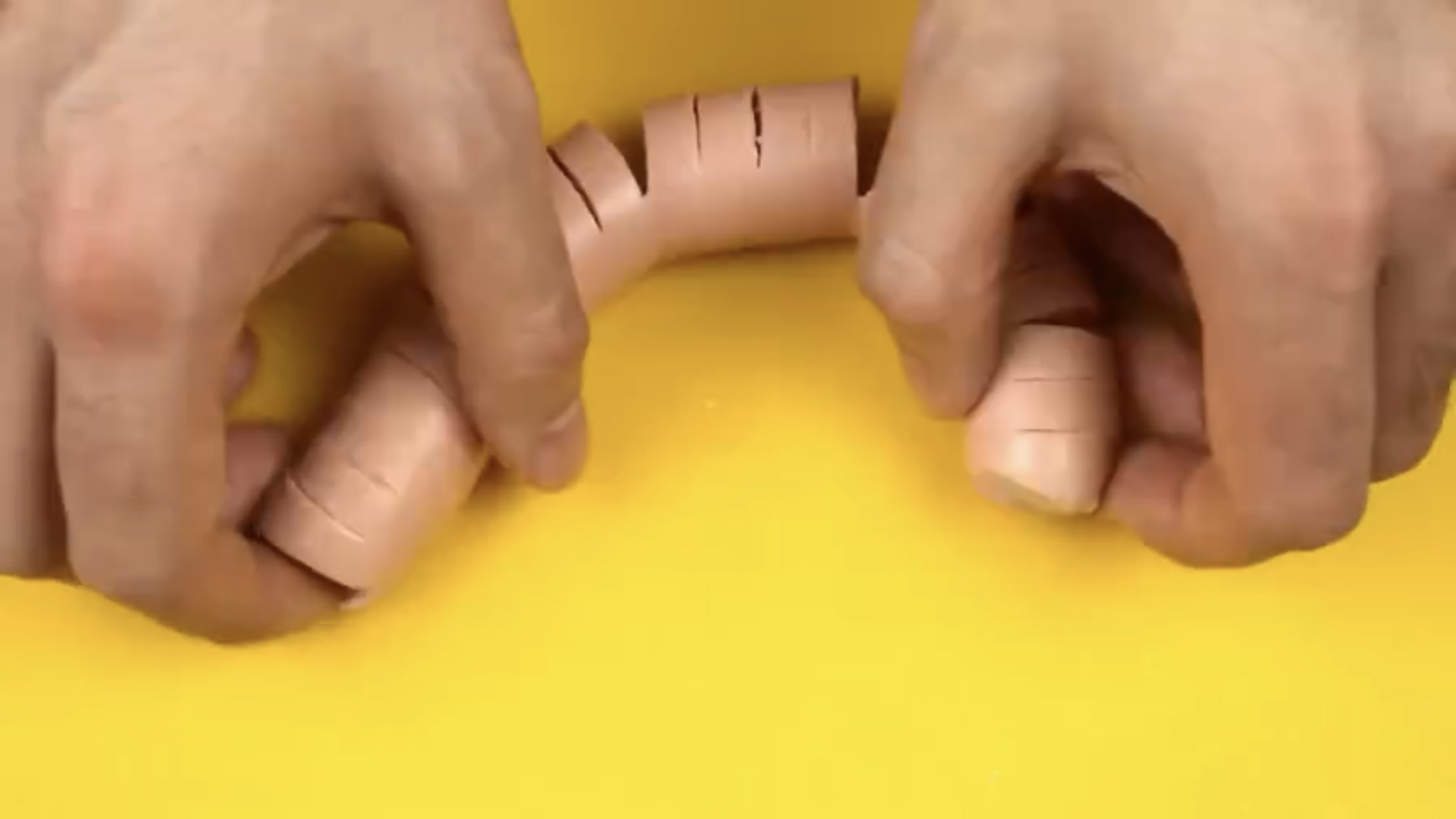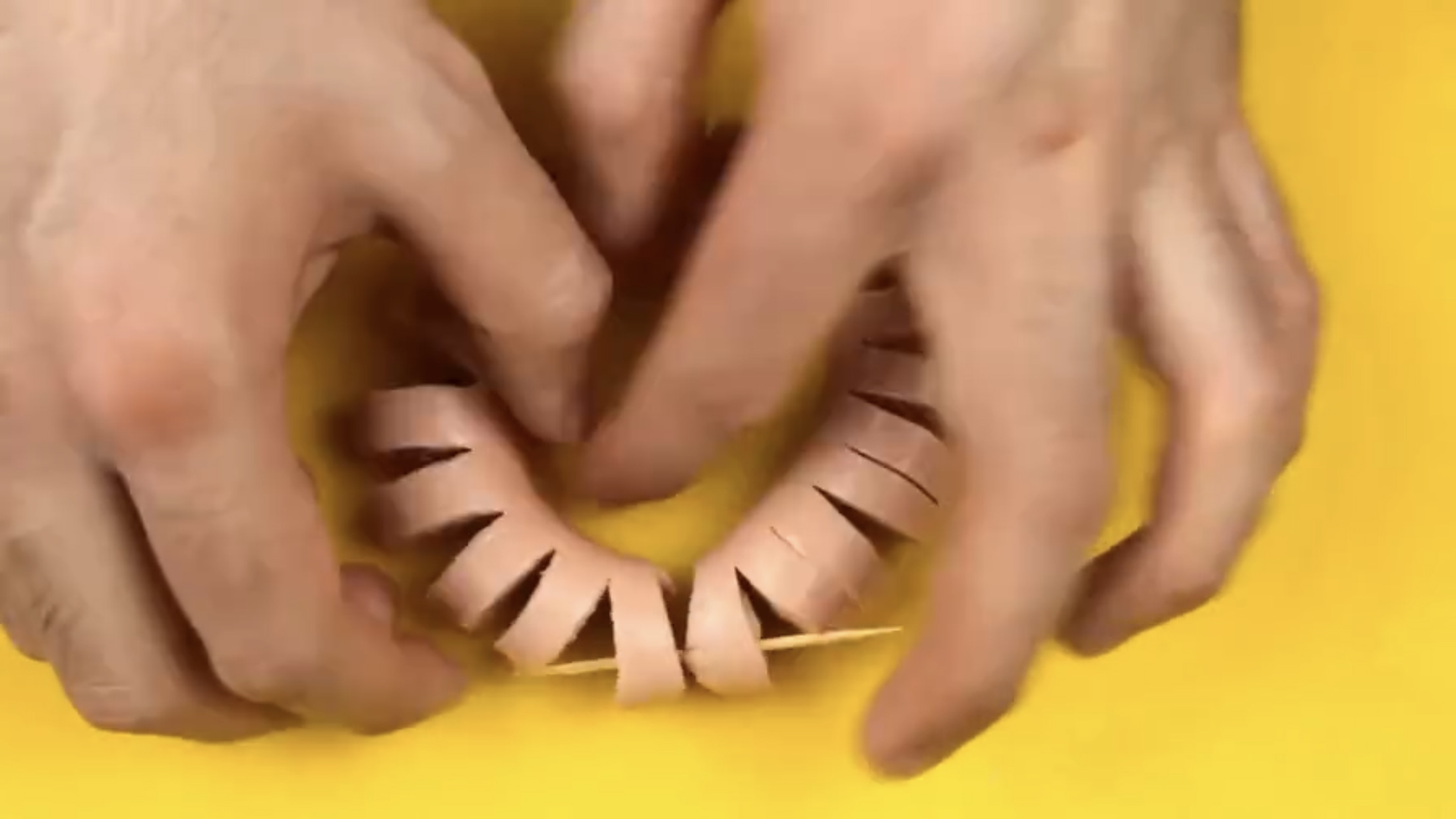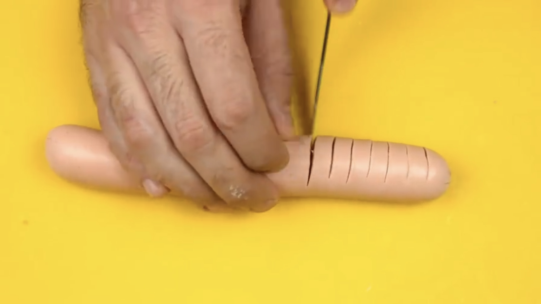 a. 首先将香肠一侧切出若干缝隙,但不要切断。
