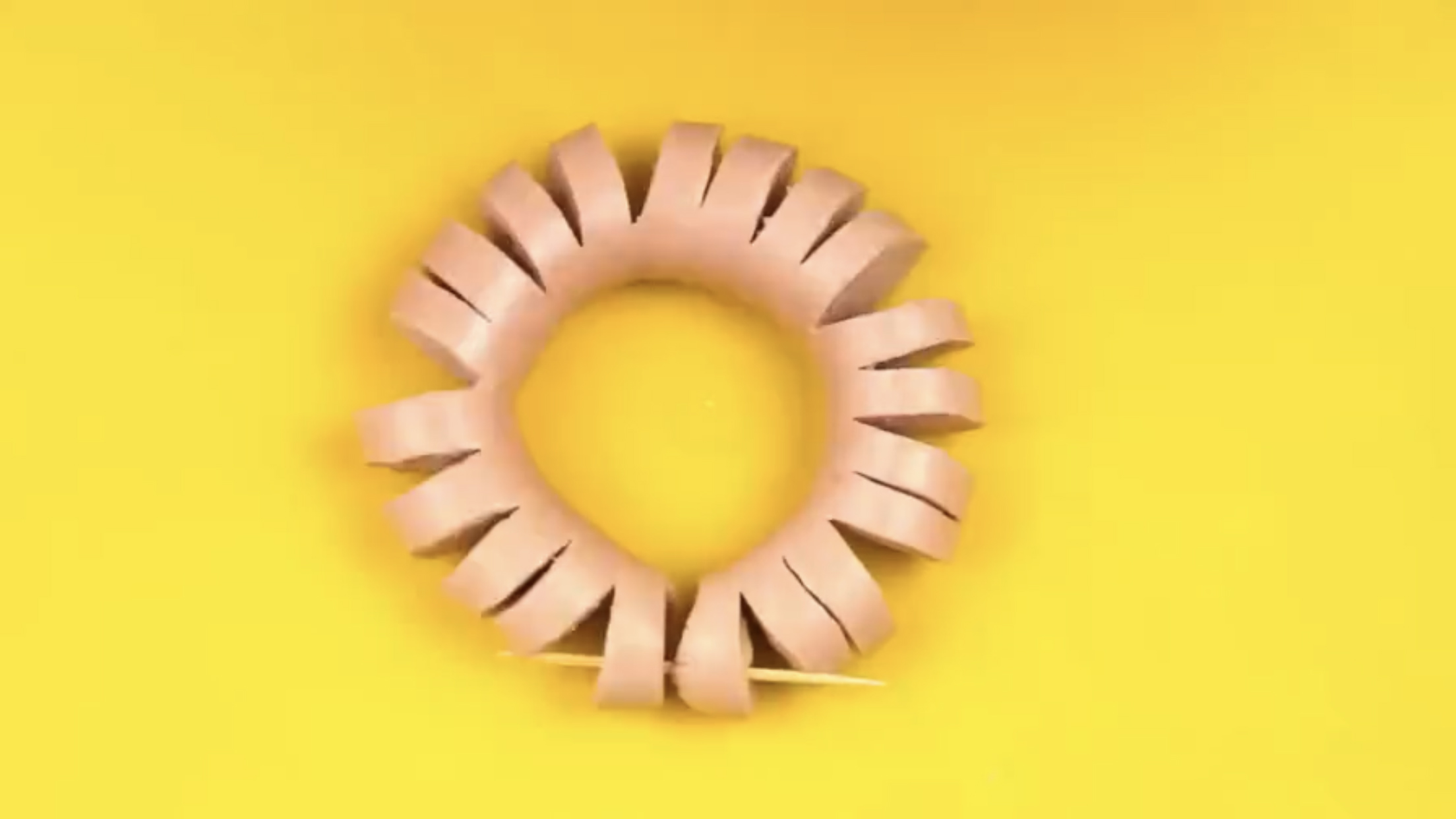 b. 然后将切好的香肠沿着连接部分围城一个圆圈,用牙签将其首尾相连。