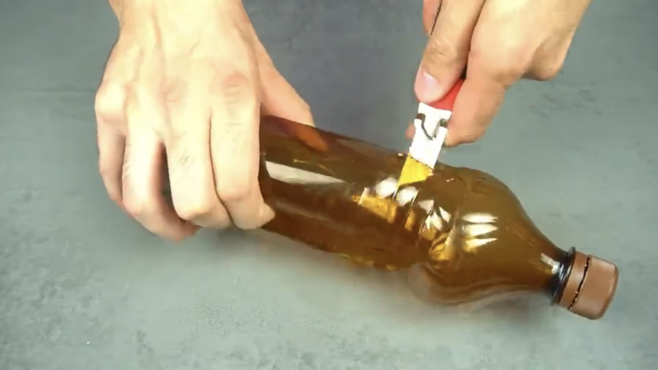 b. 然后用小刀把没有扎孔的瓶子腹部裁剪掉。