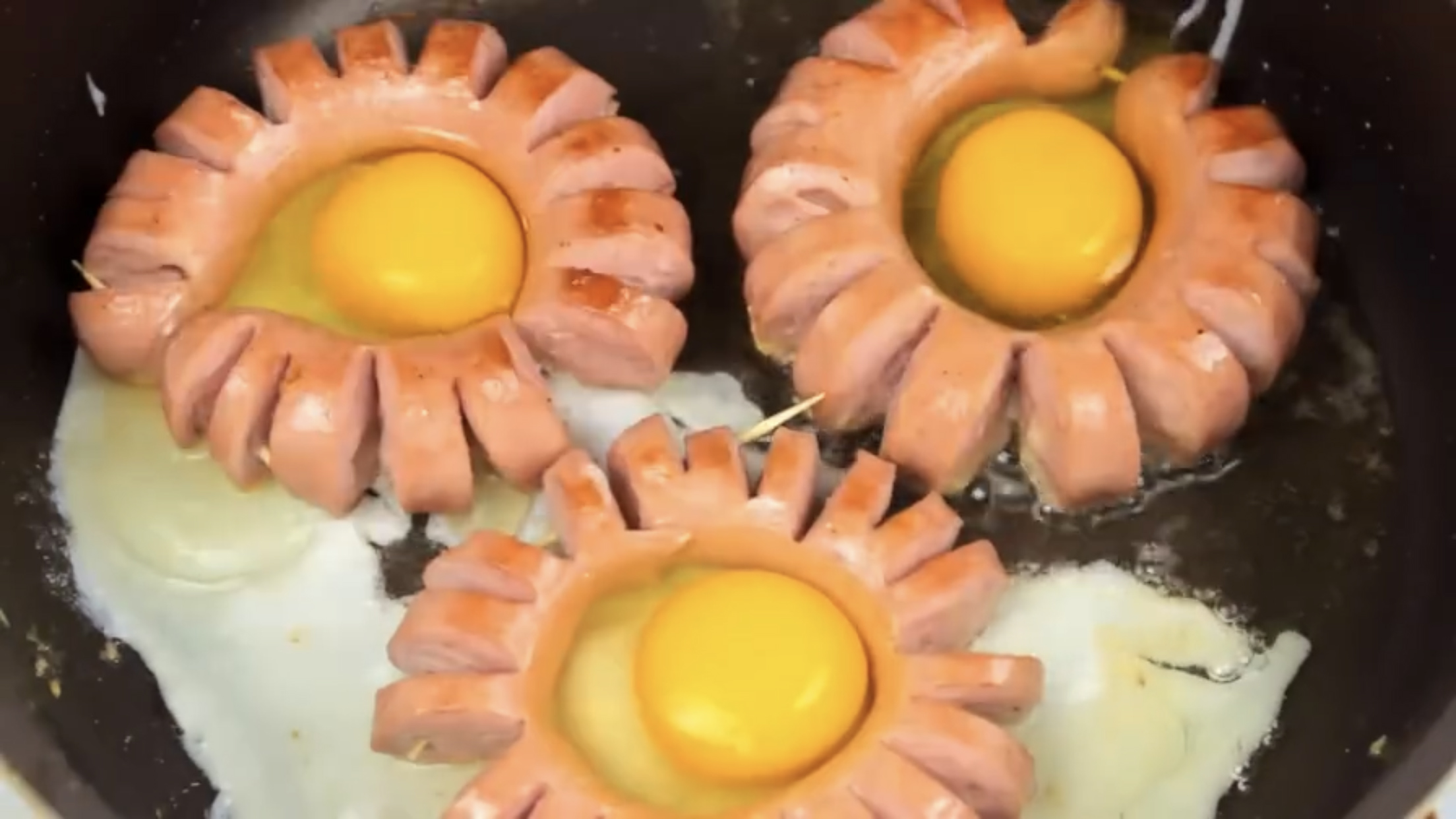 c. 然后把圈好的香肠放入锅中,把鸡蛋均匀地打在圆圈里