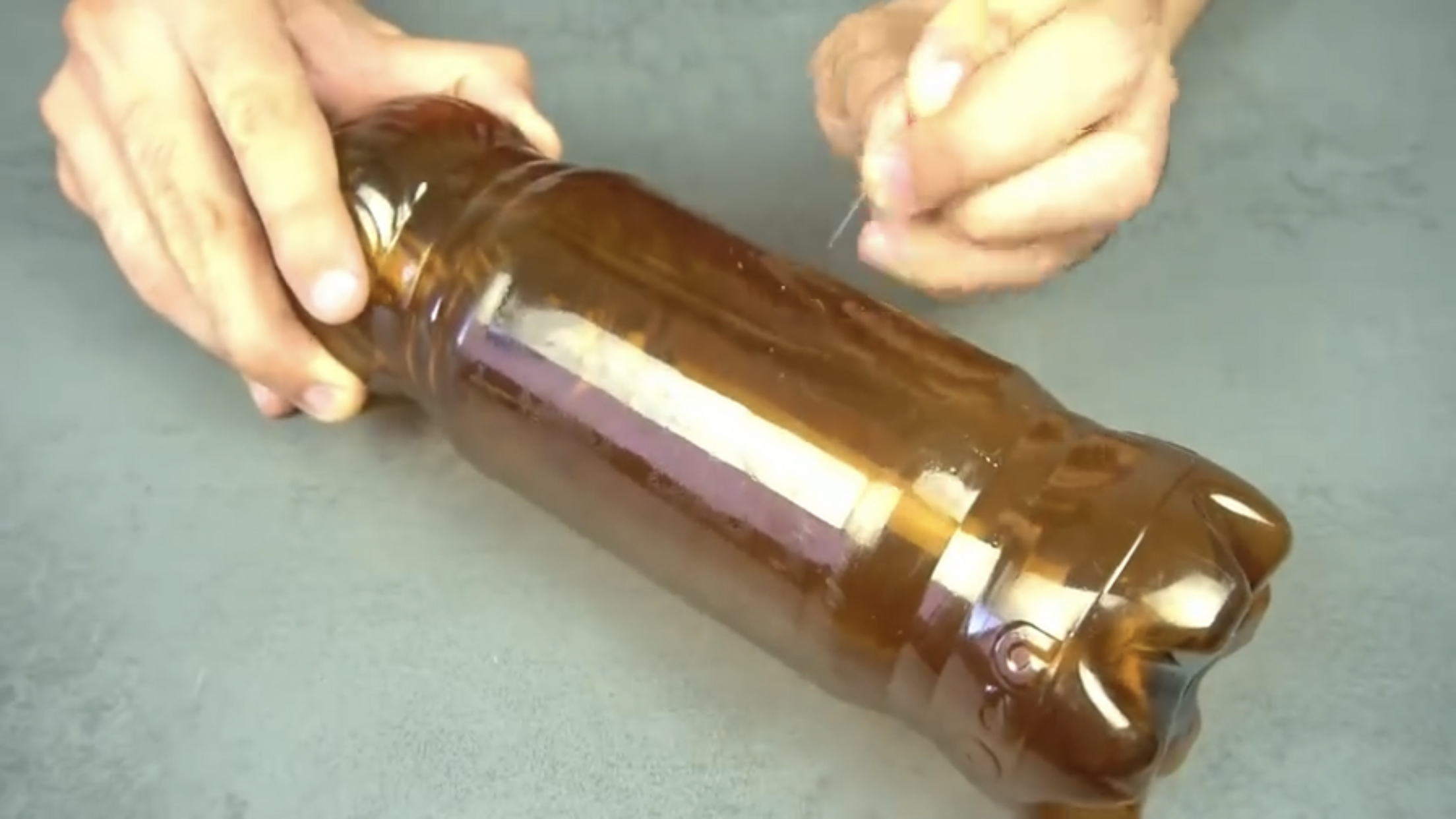 a. 首先将瓶子腹部的一侧用牙签扎出均匀的小孔。