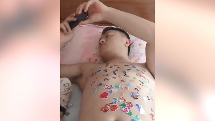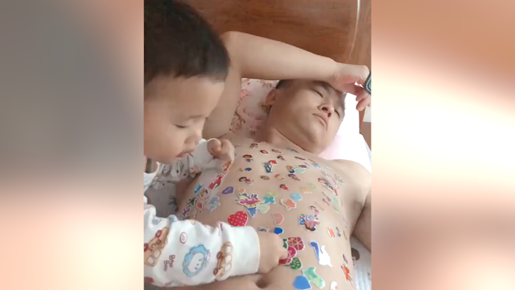 想必不少人会说有吧!现在我们来看看这个宝宝在做什么吧!没错,就是在给光着上身的宝爸贴贴纸呢。