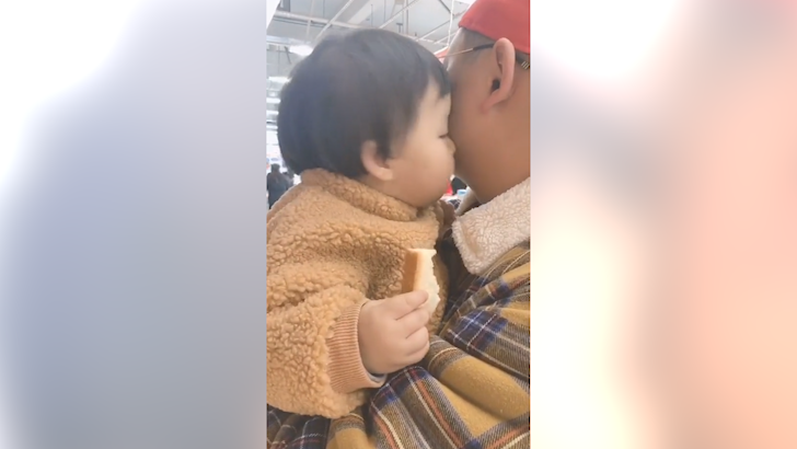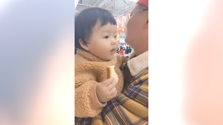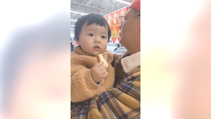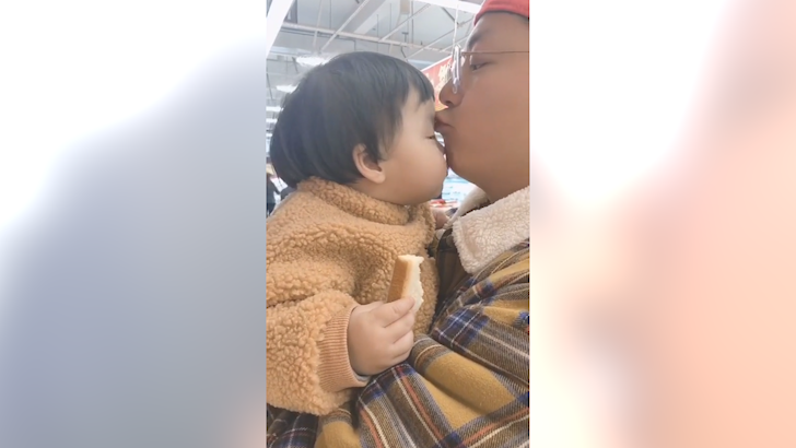 下面我们看看这个宝爸和宝宝在做什么吧!宝爸宝妈带着宝宝一起来超市逛逛,来到超市少不了的就是买买买、吃吃吃咯。宝爸抱着宝宝一路逛一路吃的,宝宝手上拿着一片面包,已经吃了一大半了,因为宝妈需要买东西,宝爸和宝宝就在原地等着宝妈。