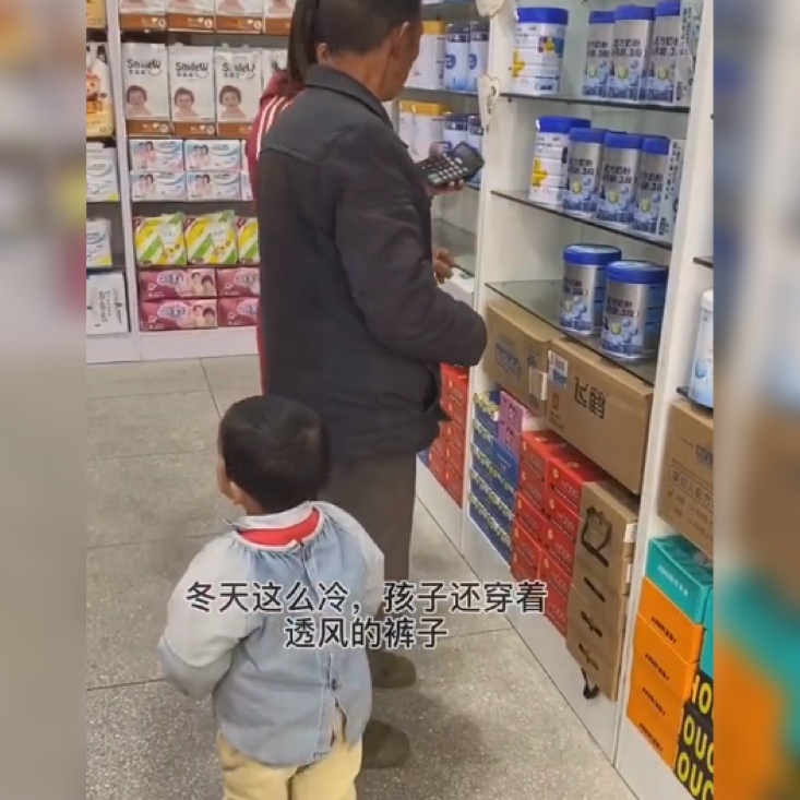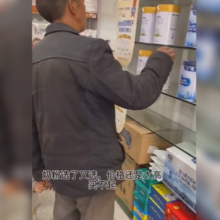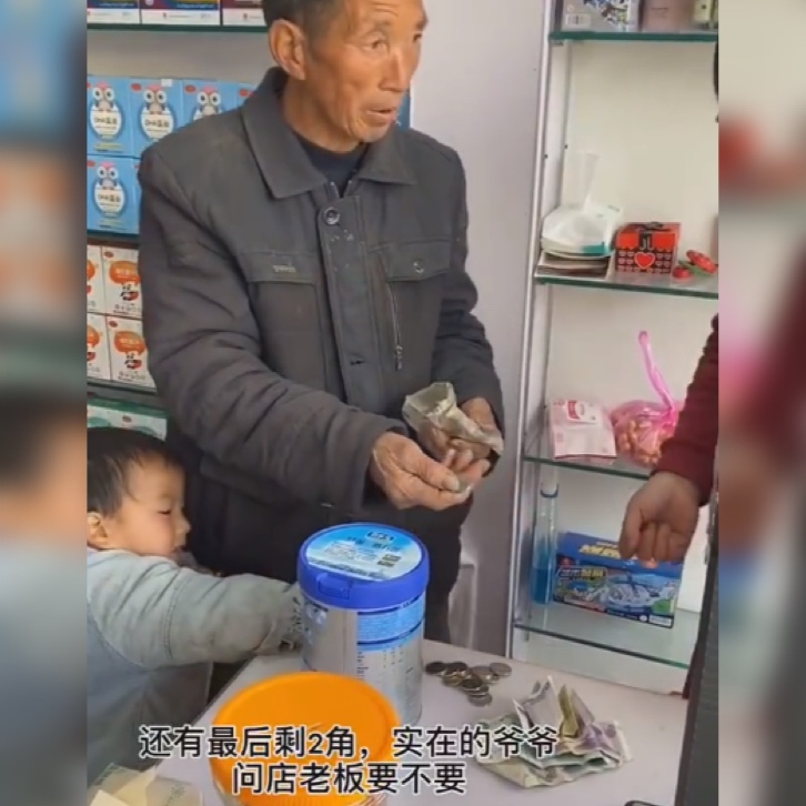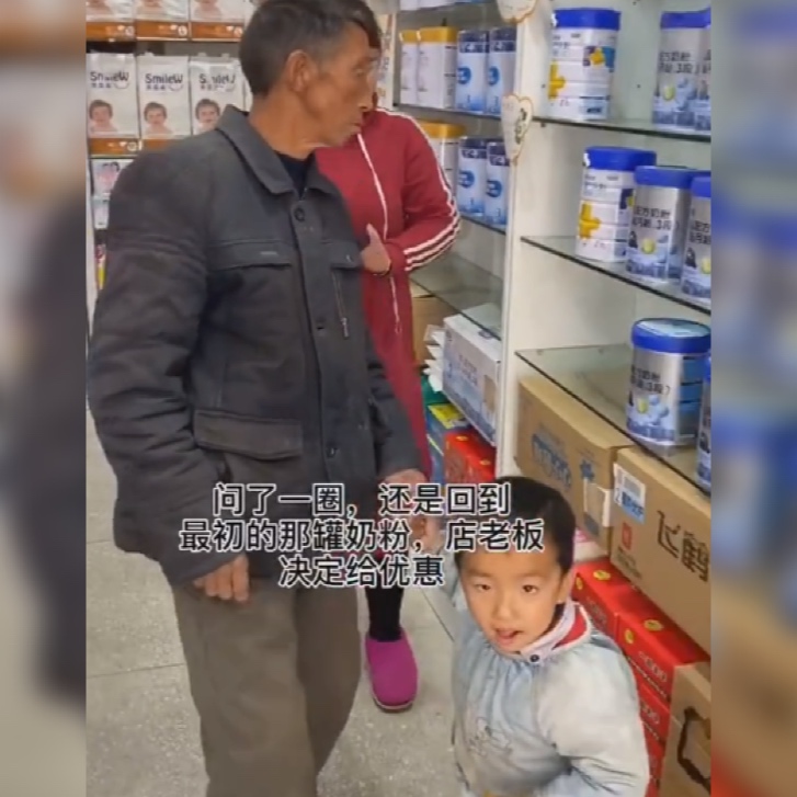 老爷爷在奶粉展示柜上选了又选,都还是觉得价格太高,无力支付。看到这一对爷孙囊中羞涩,店老板也没有嫌弃,而是一遍一遍地给老爷爷耐心地介绍着价格。问了一圈,老爷爷还是回到了最初的那罐奶粉,店老板看了看价格,决定给出老人一些优惠。
