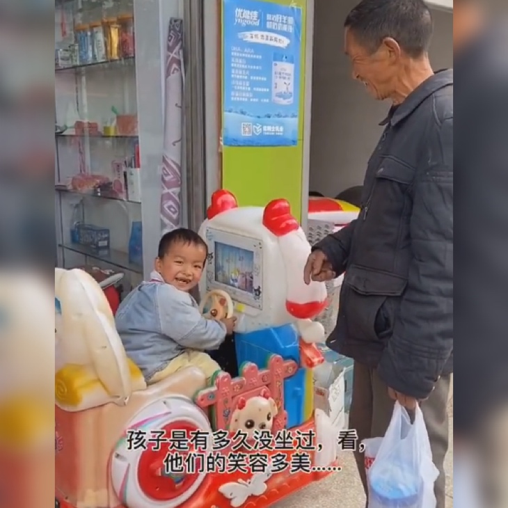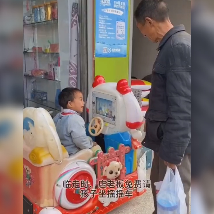 结算的时候,老爷爷先是掏出了一打纸币,然后又摸索出了好不容易攒下的一堆硬币,然后把硬币一个一个地数给老板娘,那样子让人看了觉得很是心酸。老板娘看到老人这么疼孙儿,也不禁动了恻隐之心,于是在等老人付完钱之后,免费请孩子坐摇摇车。最后两人离去的时候,老板娘还送了两罐奶粉给他们,并让丈夫开车送他们回家。