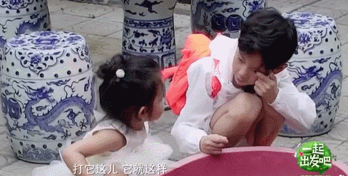 身旁的小妹妹对盆里的乌龟充满好奇,想要去触碰乌龟的眼睛的时候,雨辰温柔地告诉妹妹,不要去伤害小乌龟的眼睛。