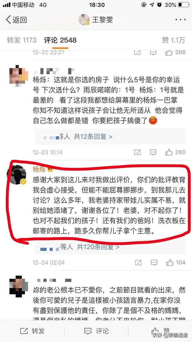 节目播出后,网友在杨烁老婆王黎雯最新微博下面吐槽杨烁教育有问题,对孩子太凶了!杨烁本尊评论:我老婆带孩子很辛苦,请大家屈尊挪步去我那儿讨论,别给她添堵。还表示会向孩子道歉。