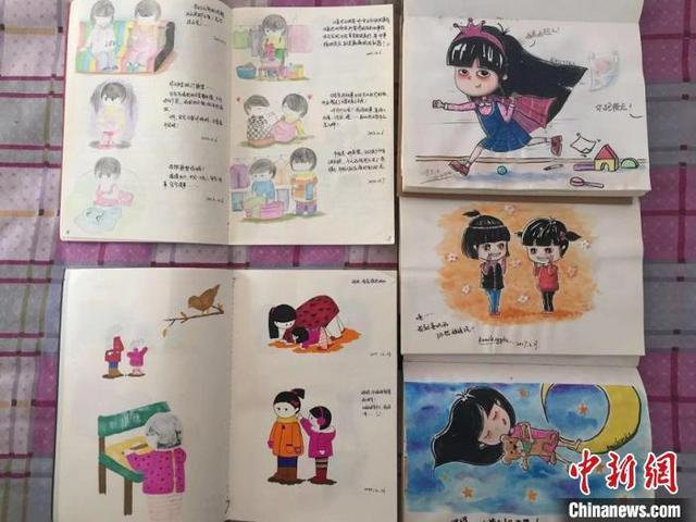 “你的成长,我不会缺席。”25日,山西省太原市,“80后”暖心妈妈王云霞向记者展示了厚厚的5本育儿画本。自孕期起,她坚持手绘,用500余幅原创漫画,记录了6岁女儿的成长轨迹。