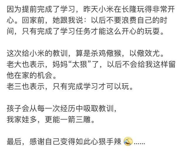 事件的最后,孩子如妈妈所愿完成了指标,这让大V也十分欣慰,对自己提出了表扬:觉得正是自己的心狠手辣,才让孩子吸取了教训……