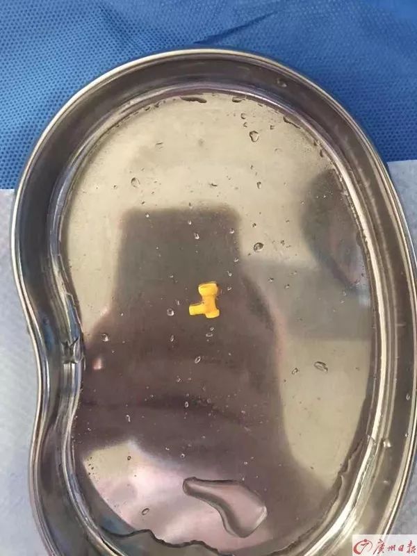 “平常异物入腔,只要找准位置将其夹出即可。但患者误吸的这个乐高玩具呈‘T’字型,‘长脚’部位又刚好卡在气管内部夹缝处,空间狭小,支气管镜难以找到‘T’型玩具的三角稳定点。加上气管内的分泌物给玩具添加了不少的‘润滑剂’,传统的取出手术未必适用。”经袁科医生和团队讨论研究,决定先用网套从喉咙进入气管,采用“半套式”的方法拉动玩具,待其位置松动后立即用支气管镜夹出。半个多小时后,这意外吸入的乐高终于被取出。
