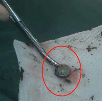 经检查在阴道口边看到有黑色物体,后来患儿说曾经有戒指样的物品、钱币放到阴道里面了 。在做好抗炎治疗后医生立即为小璇实施了手术,手术中医生从小璇体内取出了两件一元硬币大小的异物,半圆环的戒指和女式玩具鞋子。