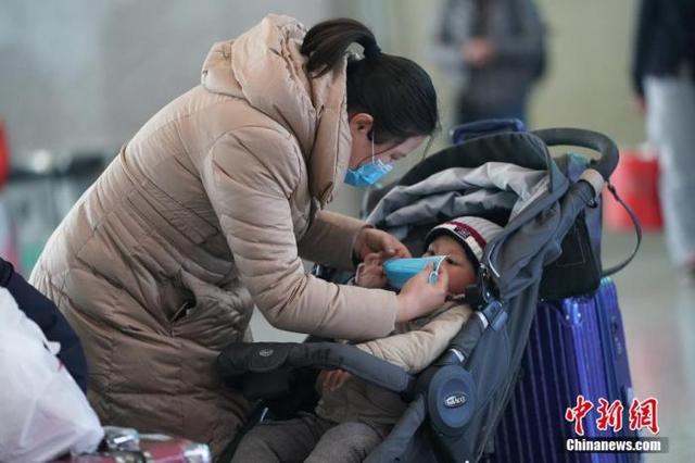 资料图:安徽蚌埠南站内,一名旅客为儿童佩戴口罩。中新社记者 张兴龙 摄