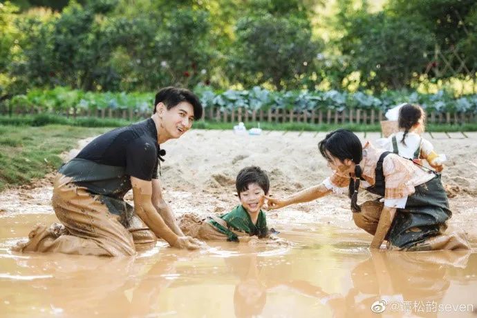 你抹我一脸泥巴,我丢你一个泥球。还有调皮的宝贝,给帅气的张新成哥哥抹了个大花脸。张新成和谭松韵也完美融入年龄段,向着小朋友们的小脸蛋上“报复”回去。