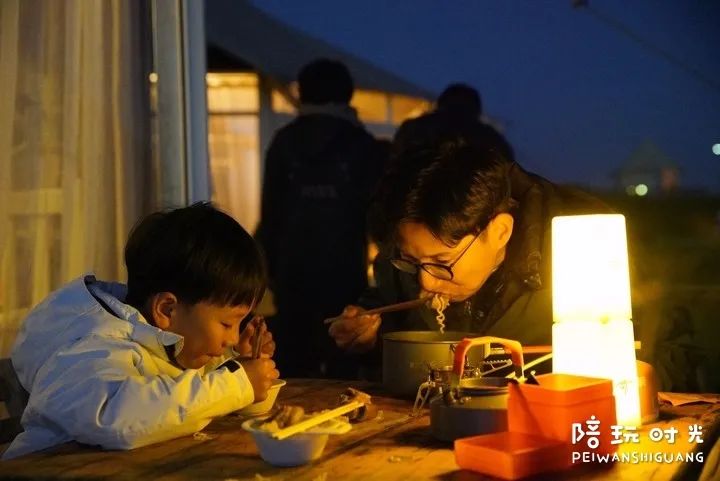 (在黄河边的帐篷酒店,我们一家子煮了一锅泡面)
