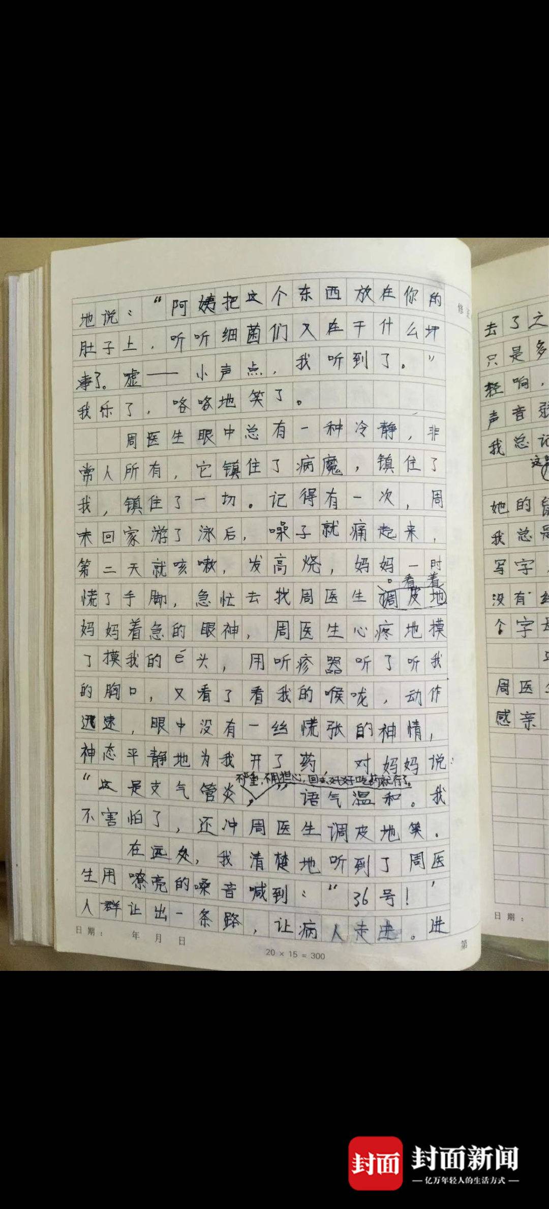 2016年初,欣欣的妈妈来到医院,把女儿的日记送给了周医生。2000个字的日记让周医生先是感动后是满眼热泪,“这是孩子们眼中的我呀”!于是她一直珍藏着。