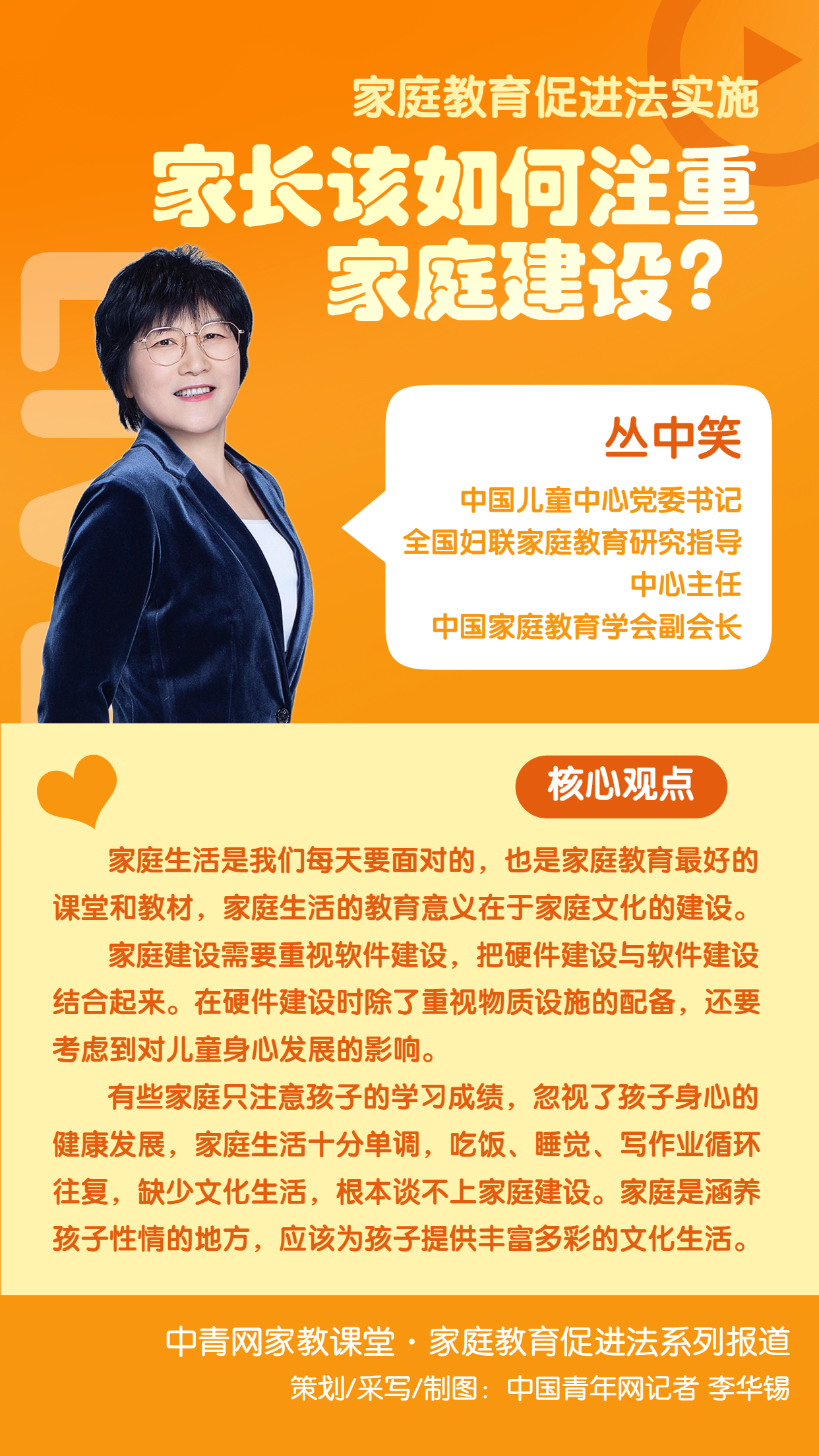 为什么要注重家庭建设,有何重要性和意义?如何引导家长注重家庭建设?有哪些方法和举措?《家庭教育促进法》实施后,家长又该如何进行家庭建设?针对以上问题,中国青年网记者专访了中国儿童中心党委书记、全国妇联家庭教育研究指导中心主任、中国家庭教育学会副会长丛中笑。