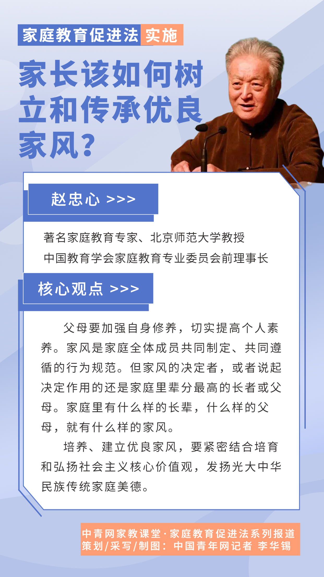那么,我国优良的传统家风包括哪些?家长又该树立和传承优良家风?中国青年网记者专访了著名家庭教育专家、北京师范大学教授、中国教育学会家庭教育专业委员会前理事长赵忠心。