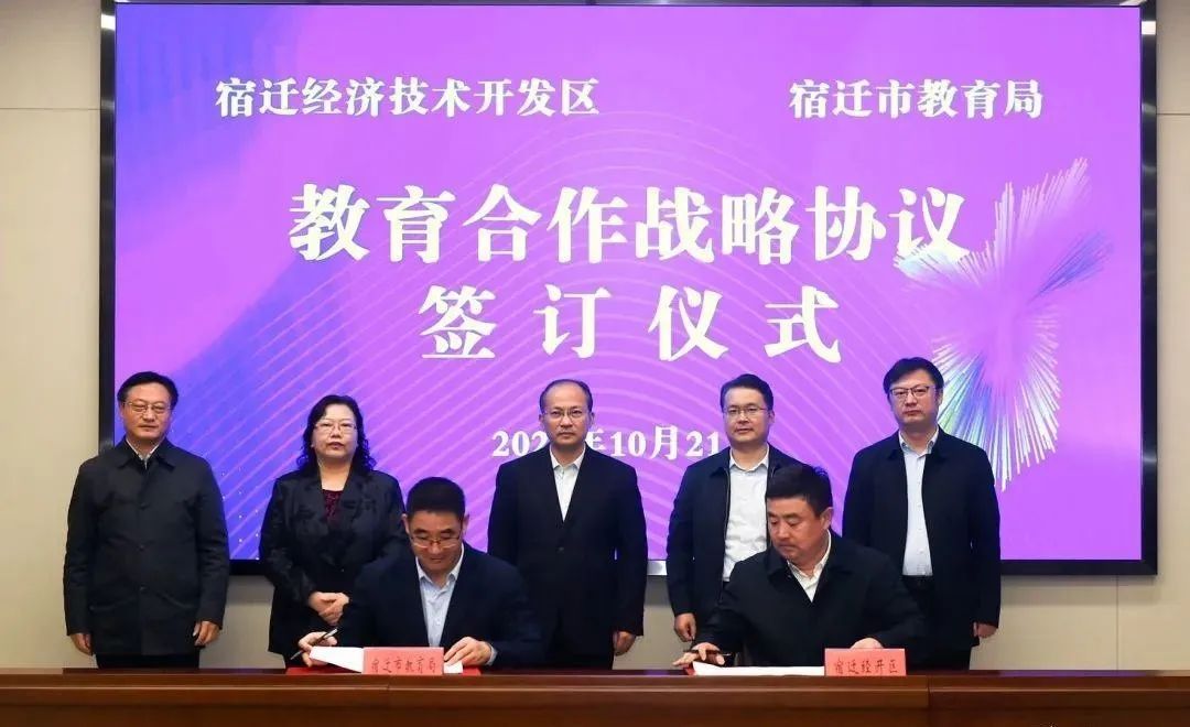 近日,宿迁市教育局与宿迁经开区举行教育合作战略协议签订仪式。宿迁市副市长、宿迁经开区党工委书记张辉,宿迁市委教育工委书记、市教育局局长倪成城,宿迁经开区党工委副书记、管委会副主任王峰,宿迁市委教育工委委员、市教育局副局长林松,宿迁经开区党工委委员、管委会四级调研员胡明出席签约仪式。