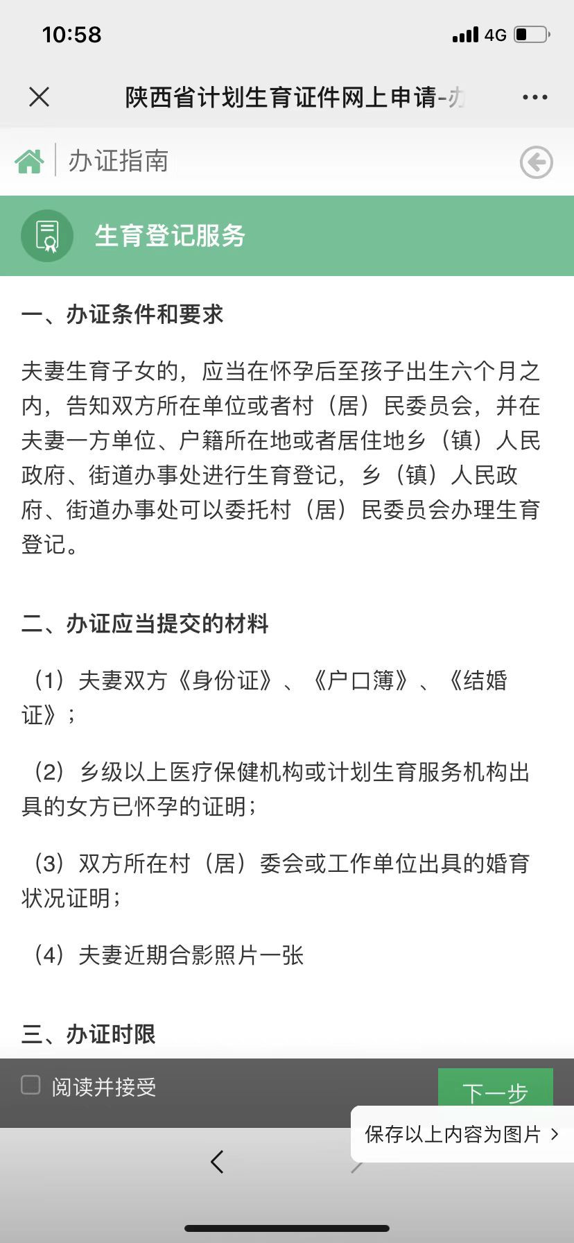 登记人可登录“健康陕西发布”微信公众号生育登记模块申请网上办理生育登记。网上申请登记的,办理机构应在登记人提交生育登记办理资料后7个工作日内办理生育登记,生成盖有电子签章的《陕西省生育登记凭证》,供相关部门调用或登记人下载使用。