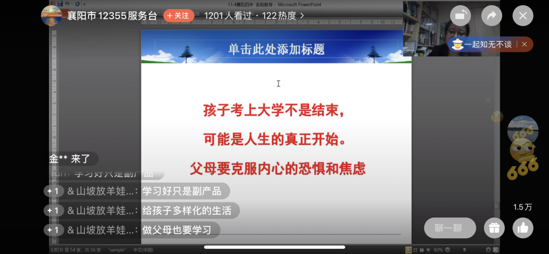 受疫情影响,湖北省襄阳市部分学校的日常教学按下了“暂停”键。市计生协主动与青春健康·沟通之道项目学校——襄阳四中沟通需求。针对学校提出的帮助缓解疫情下的焦虑情绪、指导孩子调整学习状态以及加强亲子沟通的需求,市计生协联合12355青少年服务热线,邀请专家为襄阳四中1400多名家长上了一堂生动的家庭教育直播课。针对疫情封控期间孩子的学习专注度低、缺乏社交导致情绪管理差、不主动与家长沟通等家庭教育方面的问题和困括一一解答,引导家长给予孩子充分的关爱,守护家长和孩子的心理健康。