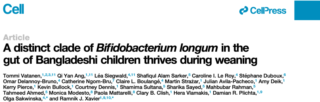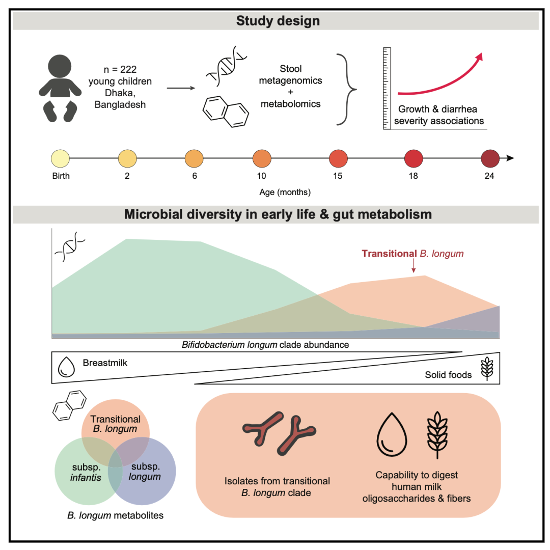 近日,Broad研究所Ramnik J. Xavier团队和雀巢健康科学公司的Olga Sakwinska团队共同在Cell杂志上发表了题为A distinct clade of Bifidobacterium longum in the gut of Bangladeshi children thrives during weaning的文章。该文对222名孟加拉国婴儿出生后前2年中的粪便微生物组和代谢组进行了纵向分析,鉴定出3个长双歧杆菌分支,其中一个可利用母乳寡糖HMO和植物多糖的分支在混合喂养期间占据优势。此外,还发现这些长双歧杆菌分支及其相关代谢物与婴儿腹泻和生长有关。