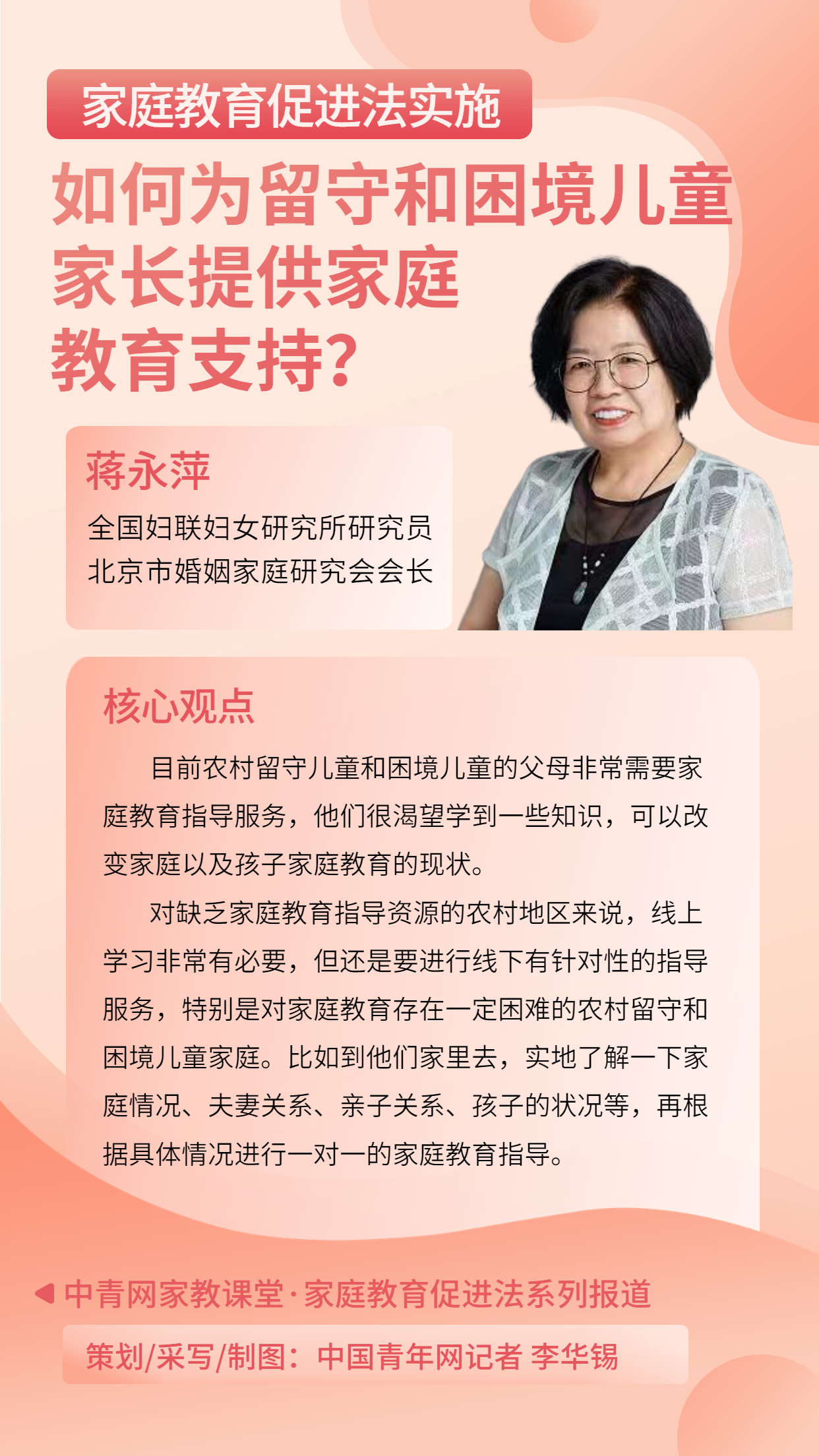 目前我国留守儿童和困境儿童的家庭教育现状如何?为留守儿童和困境儿童家长实施家庭教育提供服务,存在哪些困难?《家庭教育促进法》实施后,又该如何为留守儿童和困境儿童家长实施家庭教育提供服务?中国青年网记者专访了全国妇联妇女研究所研究员、北京市婚姻家庭研究会会长蒋永萍。