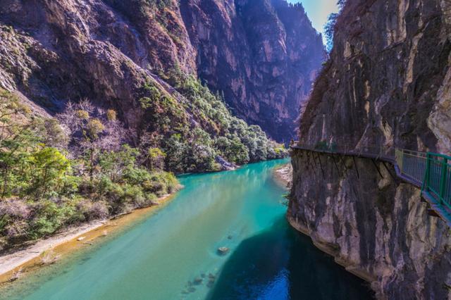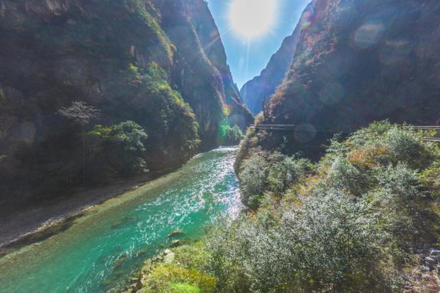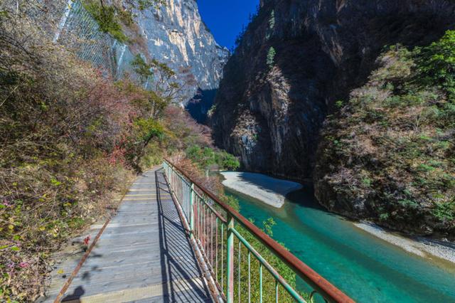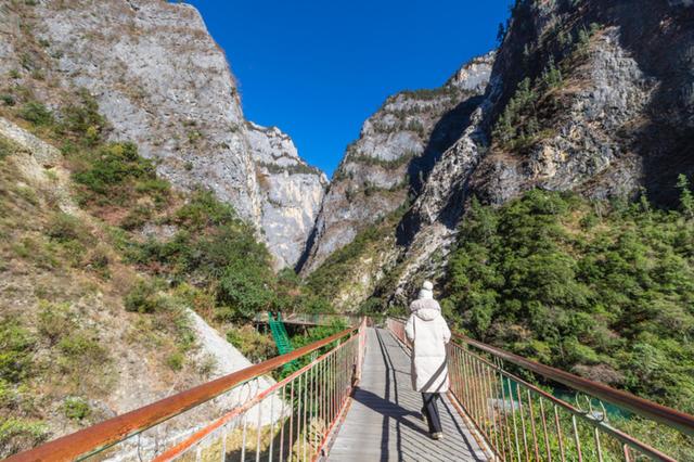 香格里拉 大峡谷的全貌在一般情况下人们是不可能看全的,但是走在栈道上就能够整个欣赏,很有一种“一览众山小”的感觉。由于巨大的笔直海拔的各种落差情况,使得这里四季景象都能仅售眼帘,山脚仿佛能看见一条宛如巨龙般的大河穿行在峡谷之间。