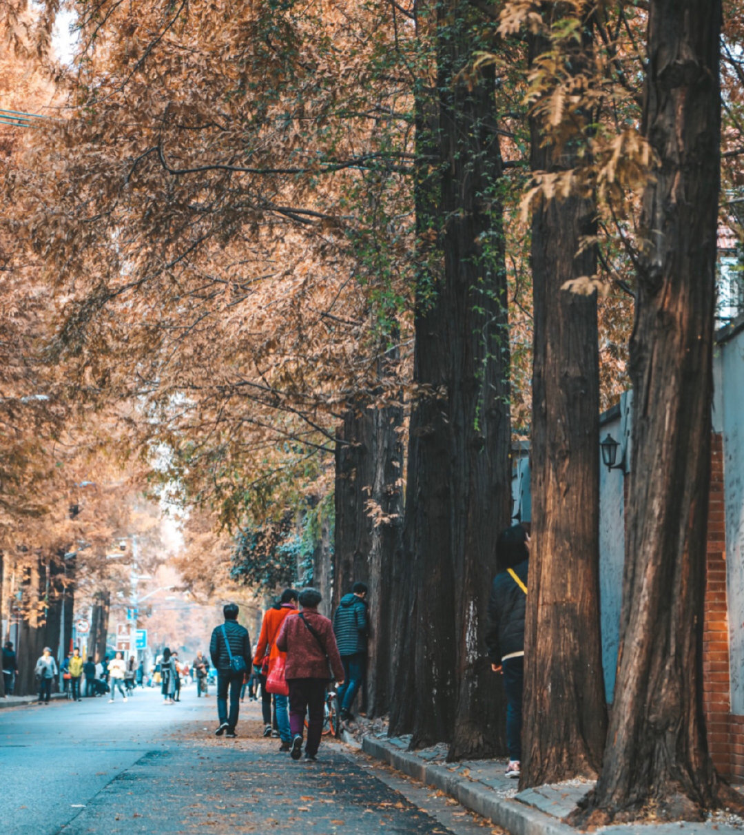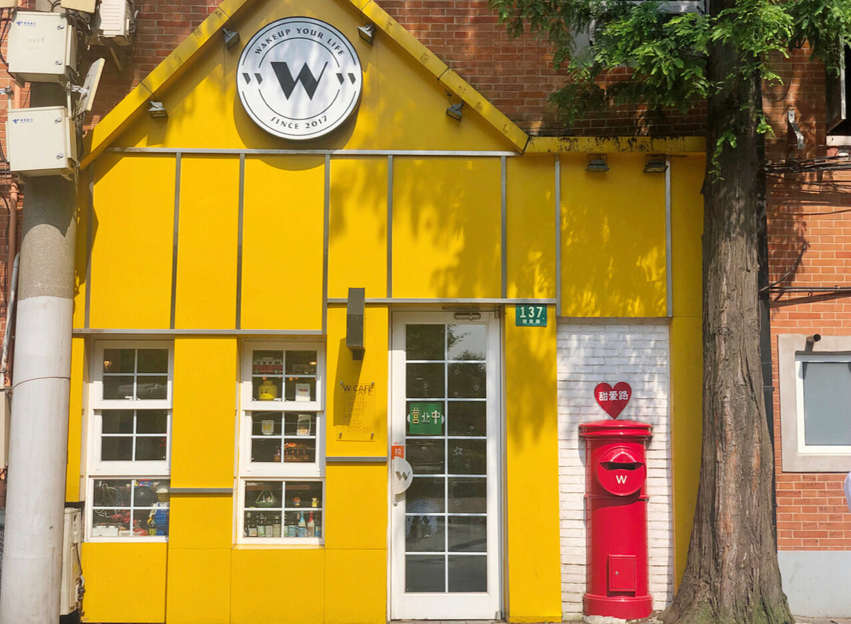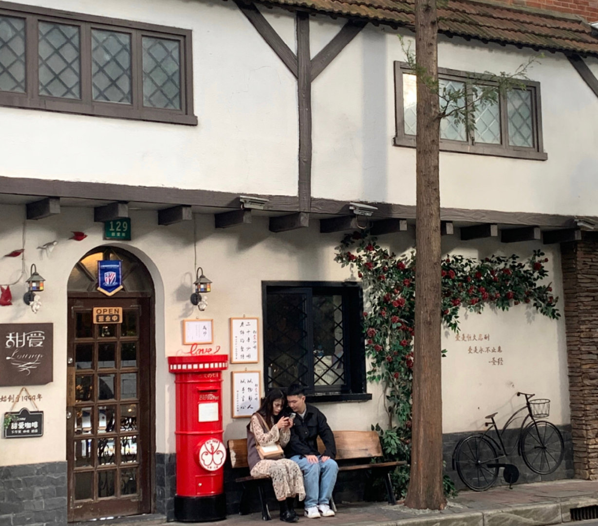 冬天的上海,水杉变成棕色,飘落在空中、散落在地面上,往来的路人,无论男女老少、结伴而行还是一人独行,都像被按了放慢键一样,举起手机、拿着相机,边走边看,记录着也细细品读着墙上的故事。这里的邮筒叫爱心邮筒,这里的水泵站叫甜爱泵站,这里的电话亭叫甜爱亭,这里的咖啡馆叫甜爱咖啡。