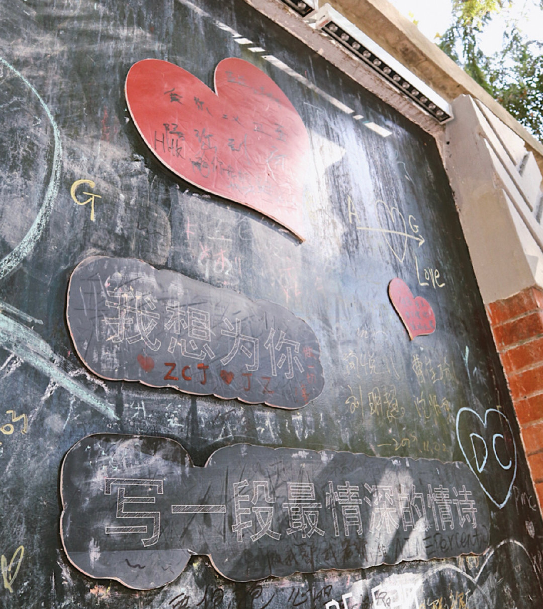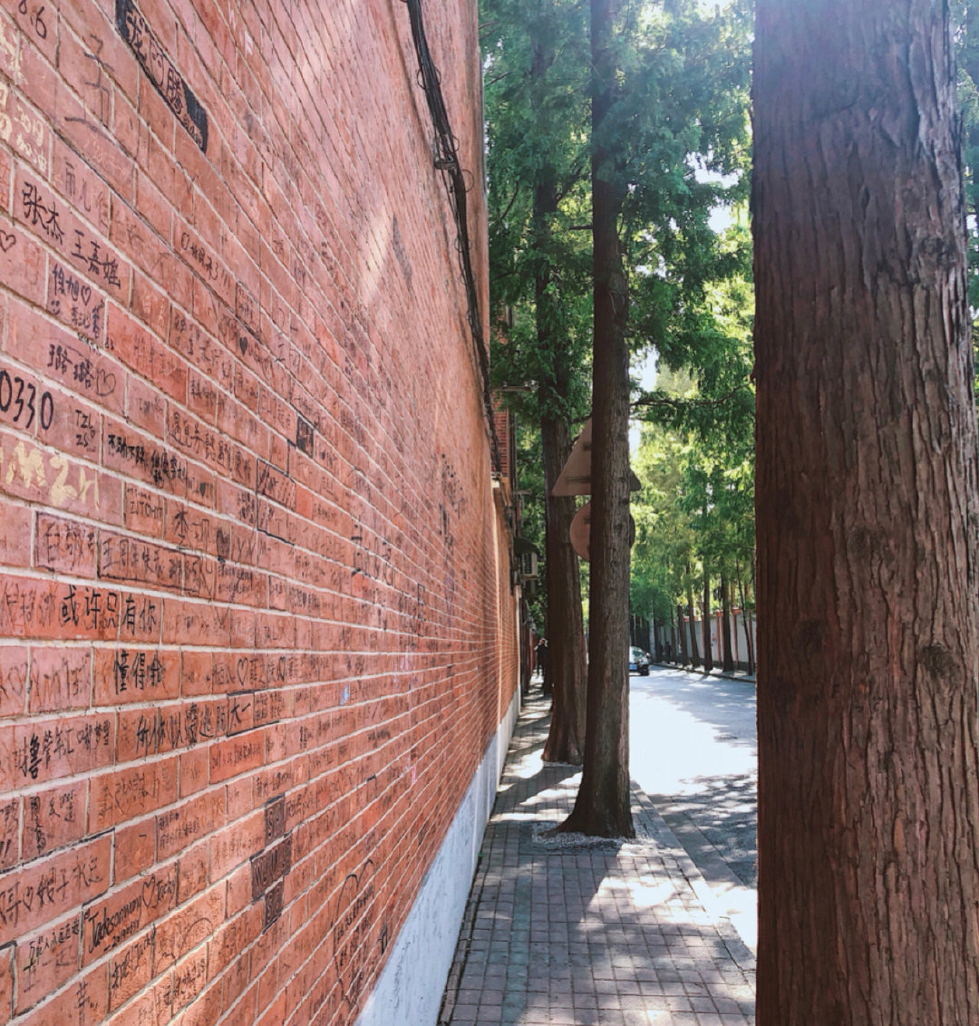 这条520米的老马路像打翻的蜜糖一样甜,不知藏匿着多少种语言书写、呼喊的“我爱你”。从四川北路走来,每一块墙砖、每一个缝隙都写满了旅者对伴侣的誓言、对亲人朋友的祝福。为朋友高考加油、为未来祝福;为爱人表白,还号称只要此墙不倒,爱情就会地久天长。