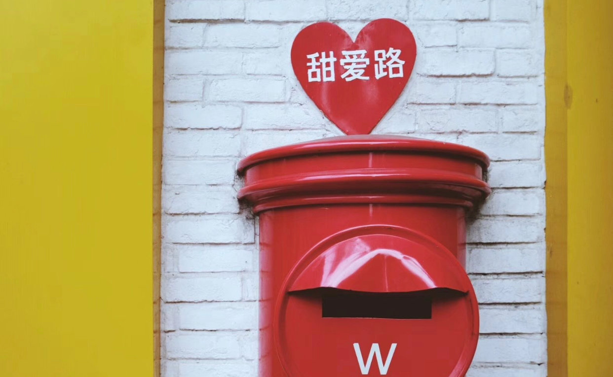 甜爱邮筒∶甜爱路的路口有一只特别的甜爱邮筒,从这座爱心邮筒投出的每一封信函,都将被盖上一枚爱的邮戳,收件人就能收到超浪漫的爱心邮戳信。