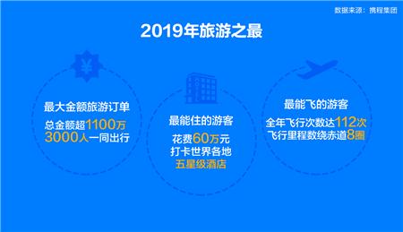 不仅热衷新玩法,越来越多敢玩敢花钱的国人,也不断刷新出游纪录。《报告》显示,2019年“最大金额旅游订单”来自携程辽宁某门店的一个邮轮订单,总金额超过1100万元,共有3000人一同出行;一位来自威海的游客全年花费60万元,打卡世界各地五星级酒店,成为2019年住酒店花费最多的用户;2019年最能飞的用户来自成都,全年飞行次数达112次,飞行里程数相当于绕赤道8圈。