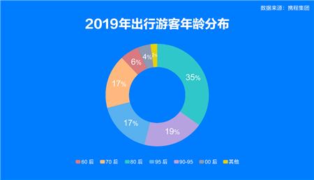 《报告》显示,2019年通过携程预订产品的用户中,80后以35%的占比,排在第一位,其次是90后(90-95),占比为19%;95后升至第三位,占比达17%,90后和95后占比为36%。而70后、60后、00后占比分别为17%、6%、4%。