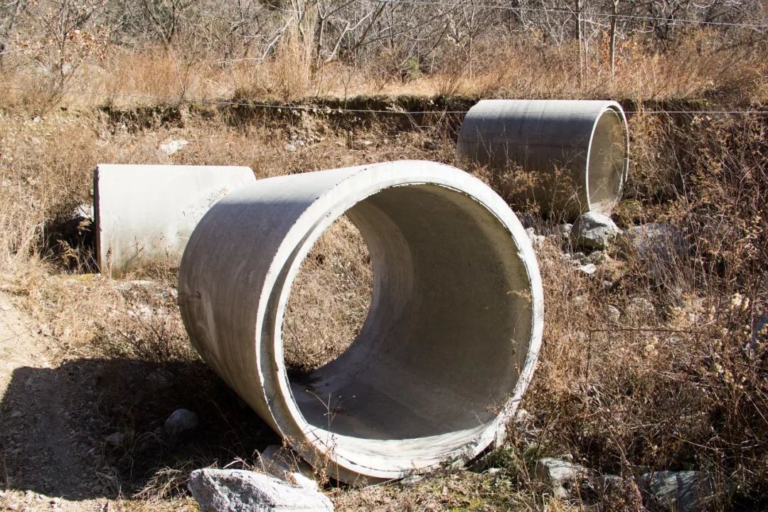 三五个巨大的水泥管放置在路边,想必是用来做简易桥的涵洞的,只可惜工程停止下来,水泥管只得这样废弃在路边。