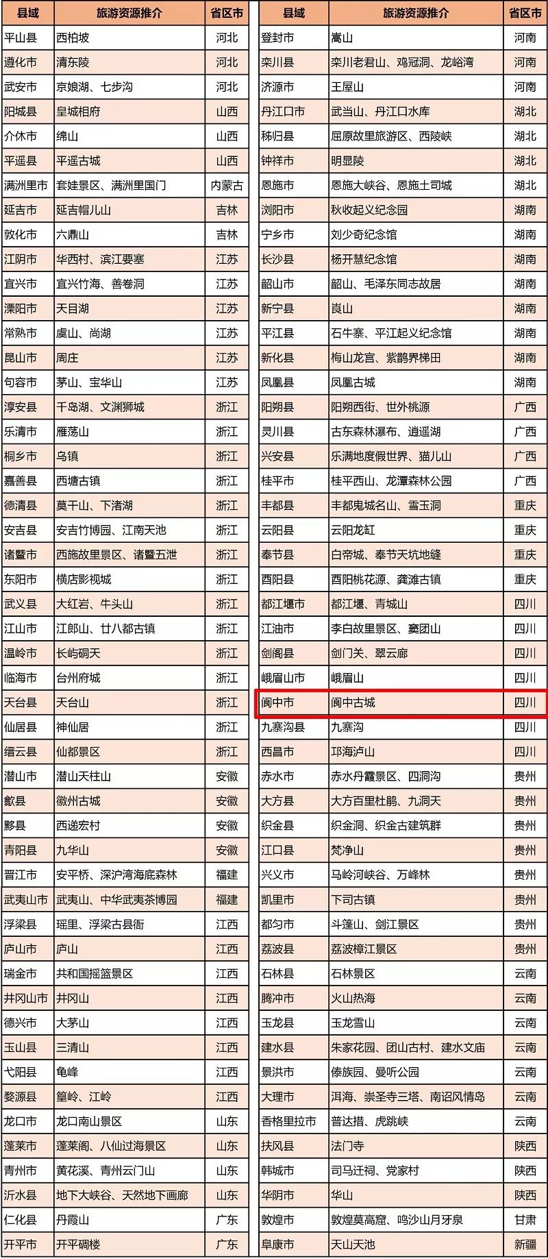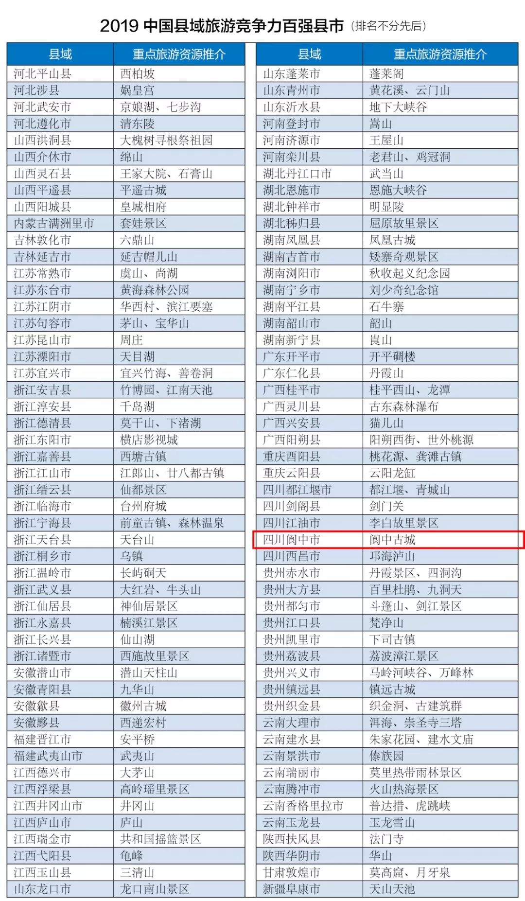 《报告》显示,2019中国旅游百强县市分布在22个省份。其中四川5个,包括都江堰市,剑阁县,江油市,阆中市,西昌市。在2018年中国县域旅游竞争力百强名单上,也出现了阆中的名字。