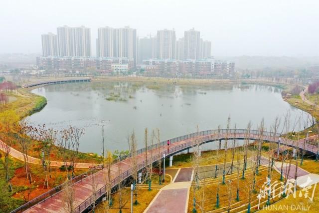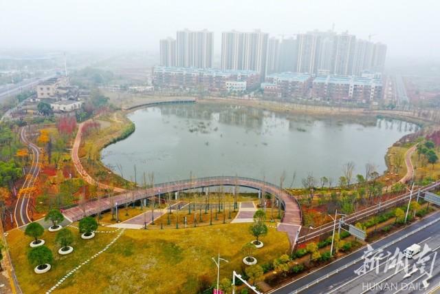 12月24日,刚刚建成的湘潭市荪湖塘公园水清岸绿,景色迷人。该公园被打造成为一个城市海绵综合体,园内透水砖铺就的小广场、下凹式的绿地、绿地边缘设有植草沟等“海绵元素”,能够对整个片区的雨水起到净化、收集、储存的作用,还可以让雨水反哺上游,实现水体循环。 湖南日报记者田超 摄