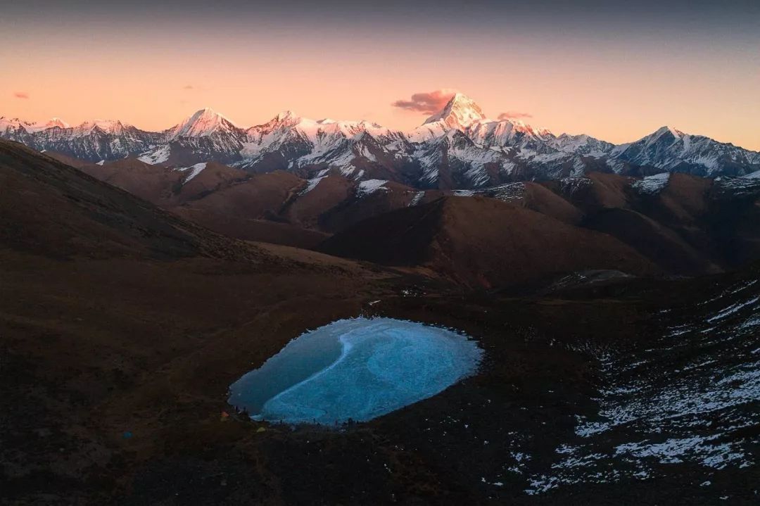 阳光下的冷嘎措透出隐隐约约的碧蓝色,远处的雪山被夕阳映成黄金般夺目的色彩,当辉煌褪去,整个贡嘎雪山呈现出迷人的粉红色。