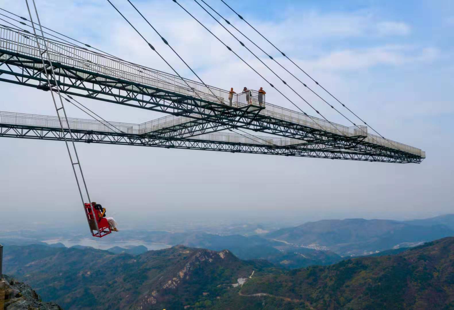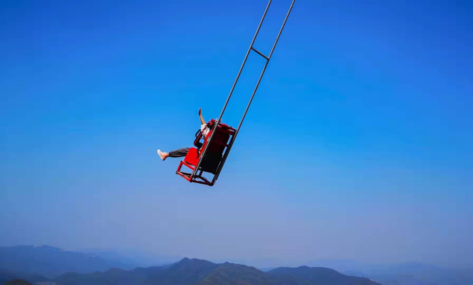 悬空玻璃观景台旁边还有几架高近10米的网红秋千,几个美女毫不犹豫地冲过去,一边系上安全装备,一边安排他人拍照拍视频,巨大的磁力将美女拉到高处,放开,美女瞬间如脱线的风筝冲出崖外,猝不及防的刺激逼出了美女心中的恐惧,尖叫声响彻空谷,一个来回后就适应了,美女又怡然自得的如天外飞仙般展开双臂,如自由的鸟儿在空中翱翔,真美!