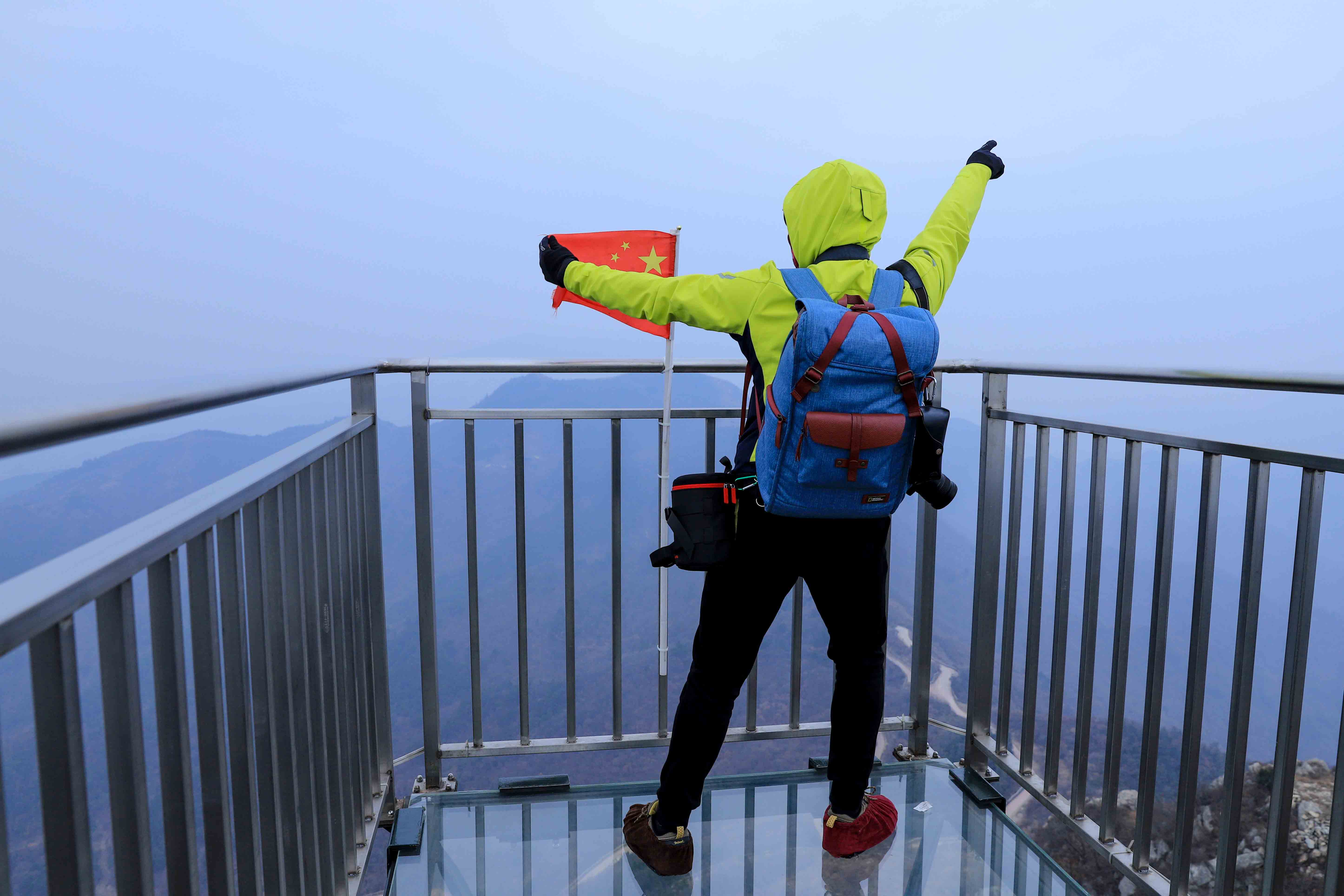 云雾山的景区观光车其实就是一景,多次被游客吐槽速度太快受到了惊吓,我却不以为然,都是老司机老路线,所有的担心都是庸人自扰,心中无路天地宽嘛。果然,观光车在蜿蜒山路上一路蛇形狂奔,20分钟后就到了目的地——海拔718米的云雾山顶,也是武汉最高峰,世界最长的悬廊玻璃观景台就在这里了,它像一个巨大的三角架伸出云天外,一幅巨龙腾空、惊险刺激的样子,我们一个个也是激动兴奋的要往上冲。
