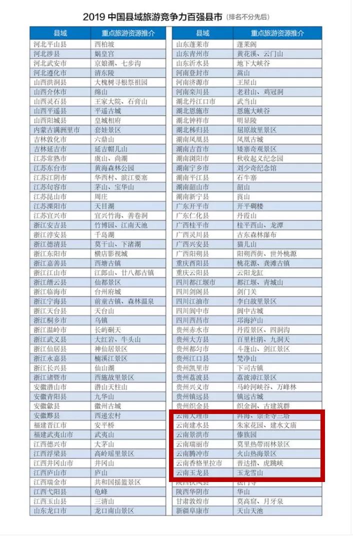 云南共有7地上榜2019中国县域旅游竞争力百强县市,它们分别是: