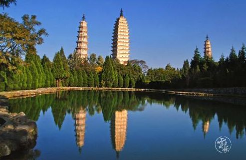 崇圣寺三塔,由一大二小组成。大塔又叫千寻塔,全称“法界通灵明道乘塔”与南北两小塔的距离皆70米,三座塔形成鼎足之势,布局统一、造型和谐、浑然一体。