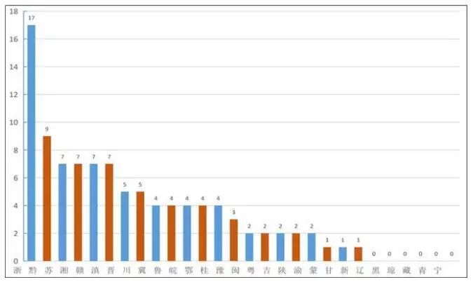 《报告》显示,2019中国旅游百强县市分布在22个省份。其中,浙江17个、贵州9个、江苏7个、湖南7个、江西7个、云南7个、山西5个、四川5个、河北4个、山东4个、安徽4个、湖北4个、广西4个、河南3个、福建2个、广东2个、吉林2个、陕西2个、重庆2个、内蒙1个、甘肃1个、新疆1个。