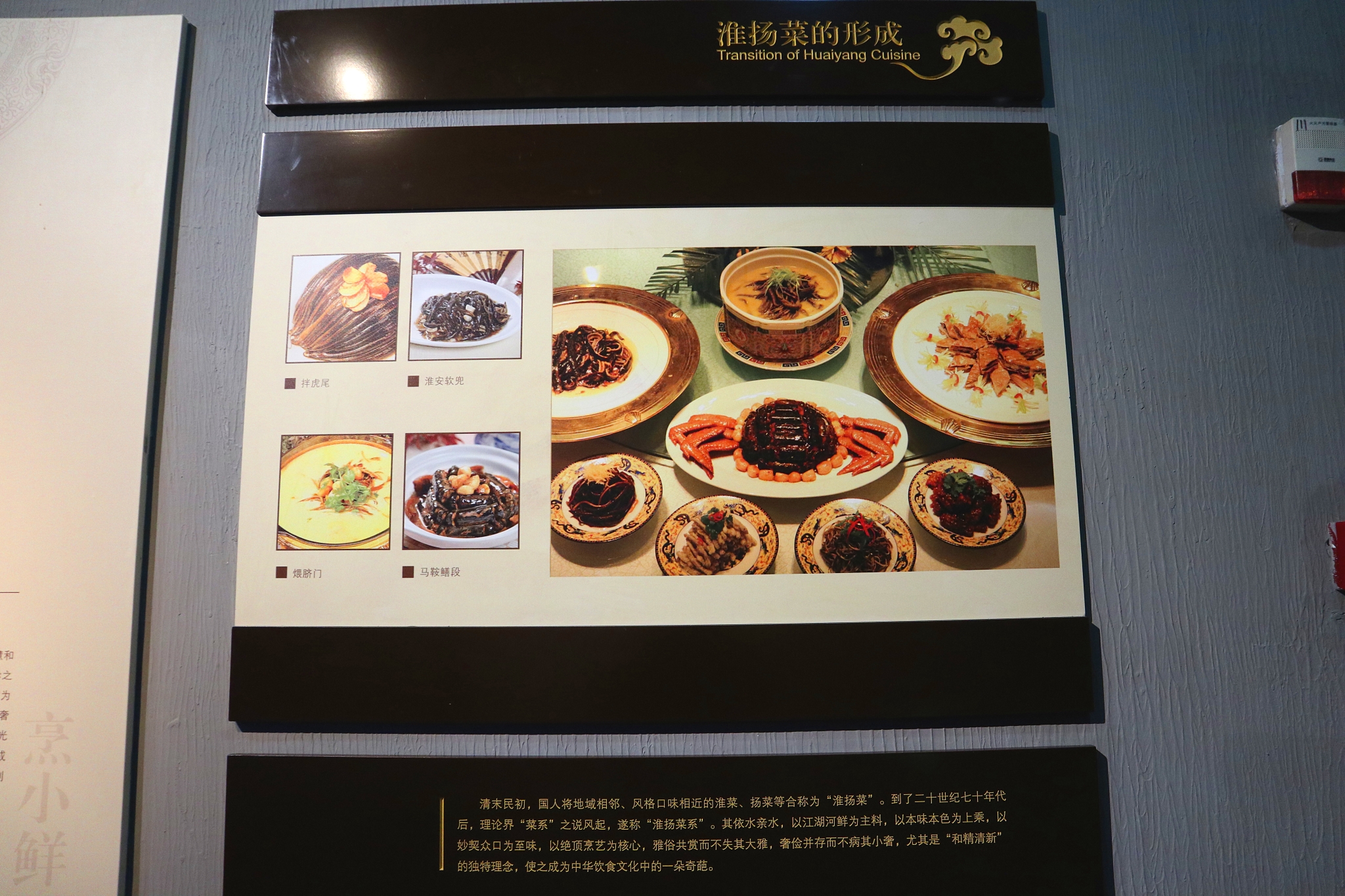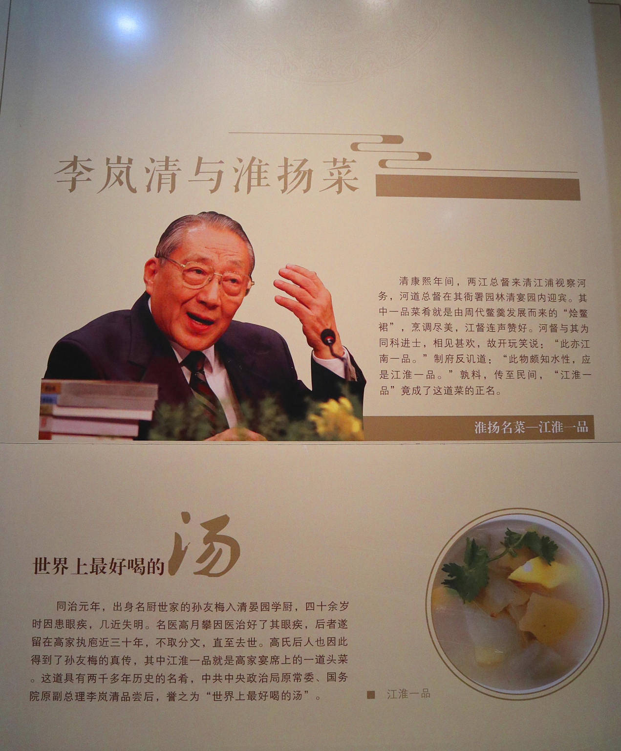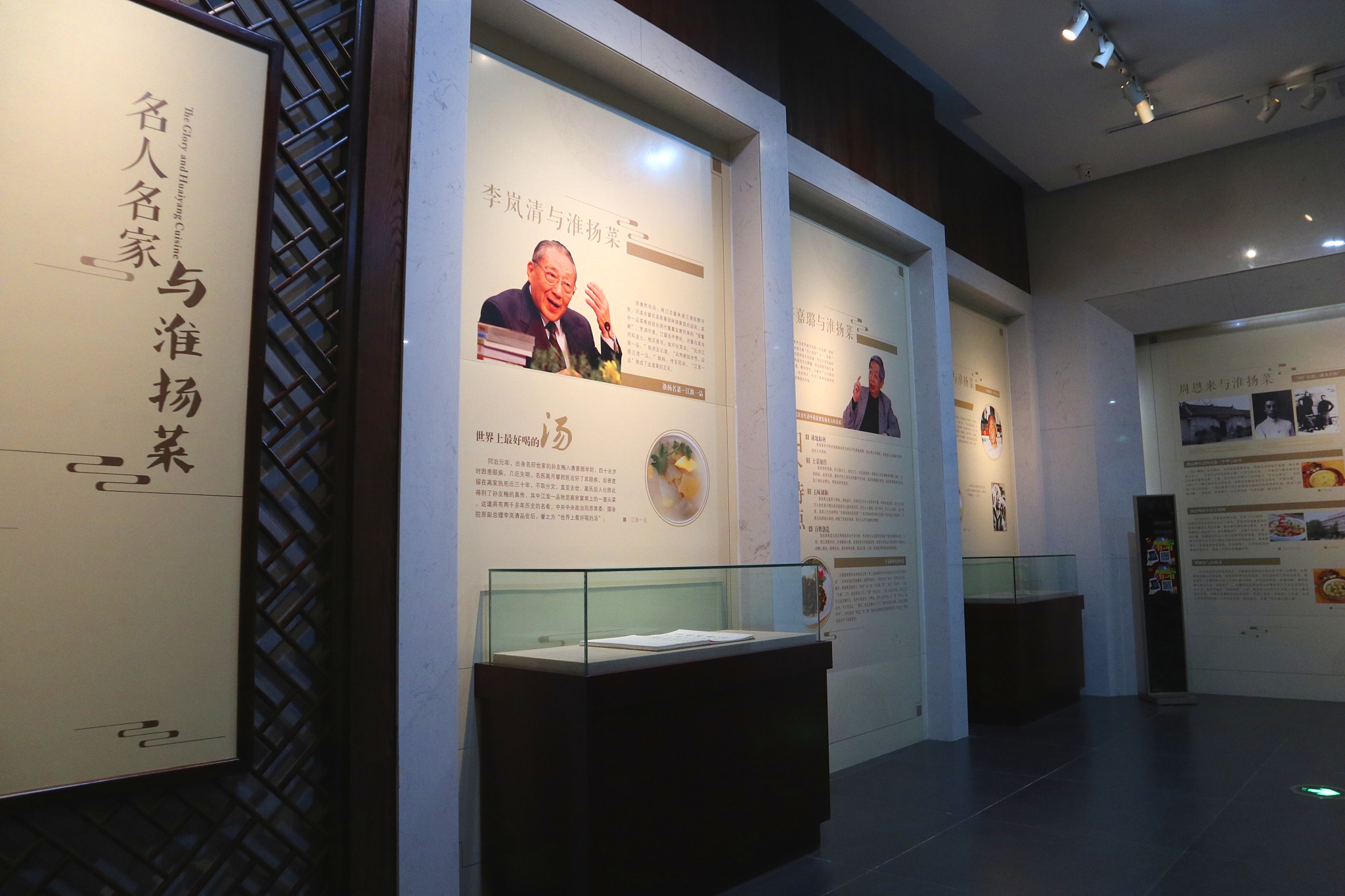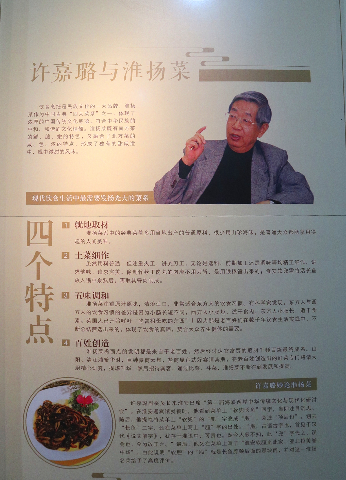 在博物馆的结尾部分,有名人名家与淮扬菜的展览。淮扬菜有四大特点。一是就地取材。淮扬菜系中的经典菜肴多用当地出产的普通原料,很少用山珍海味,是普通大众都能享用得起的人间美味。二是土菜细作。虽然用料普通,但注重火工,讲究刀工,无论是选料、前期加工还是调味等均精工细作、讲求韵味,追求完美。像制作钦工肉丸的肉糜不用刀斩,是用铁棒锤出来的;淮安软兜需将活长鱼放入锅中氽熟后,再取其脊肉制成。