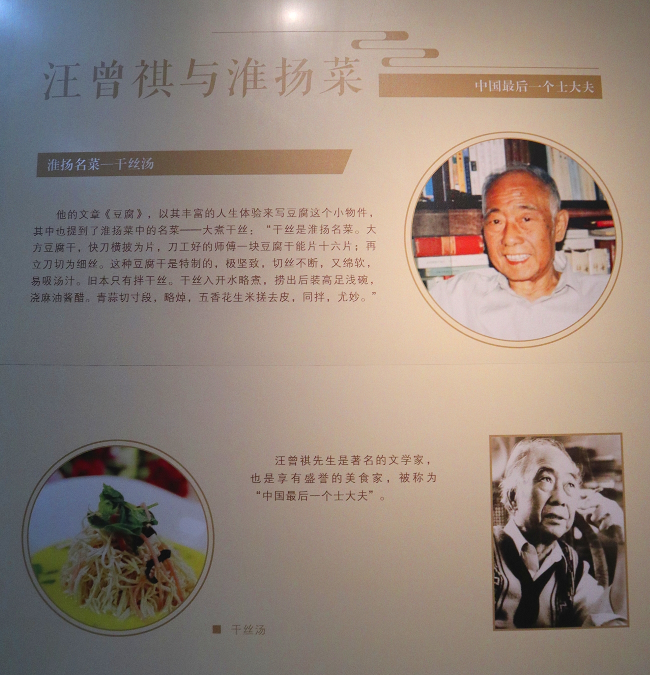 他的文章《豆腐》,以其丰富的人生体验来写豆腐这个小物件,其中也提到了淮扬菜中的名菜—一大煮干丝:“干丝是淮扬名菜。大方豆腐干,快刀横披为片,刀工好的师傅一块豆腐干能片十六片;再立刀切为细丝。这种豆腐干是特制的,极坚致,切丝不断,又绵软易吸汤汁。旧本只有拌干丝。干丝入开水略煮,捞出后装高足浅碗,浇麻油酱醋。青蒜切寸段,略焯,五香花生米搓去皮,同拌,尤妙。