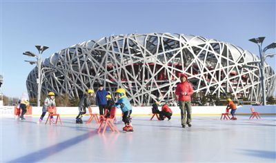 鸟巢前的庆典广场,市民在冰场内玩耍。