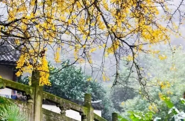 再看那寺庙里两棵银杏直冲青天,巨大的树冠缀连成片,擎天蔽日,覆盖着大半个寺院,蔚为壮观。古刹银杏与山间松涛相映成趣,云雾笼罩之下,更显梦幻和唯美。