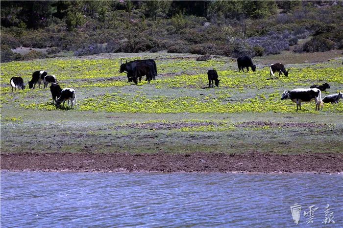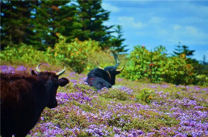 牧群徜徉在花海草丛中,悠闲地甩动大尾巴。云遮雾绕的群山青翠得如同一幅精心描绘的油画。