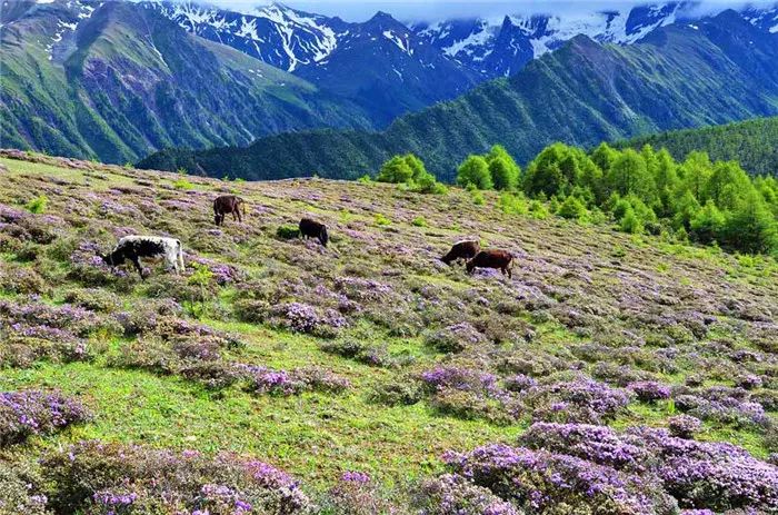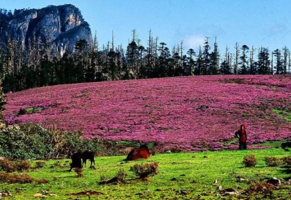 五月下旬,这里高山杜鹃、报春花、狼毒花、格桑花接踵而开,犹如梦幻般的世外桃源令人神往。